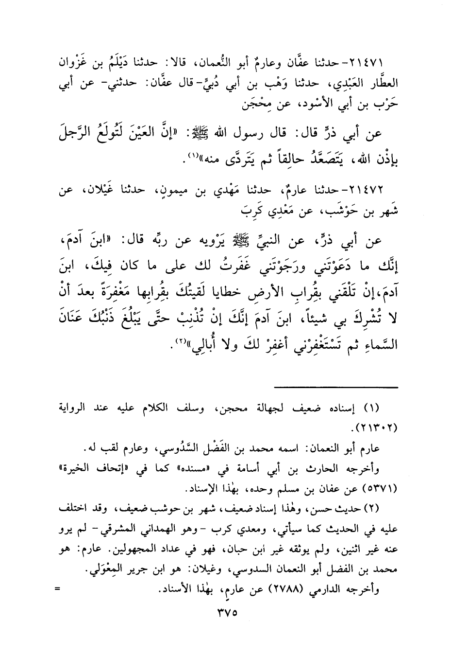 ٢١٤٧٢ - حَدَّثَنَا عَارِمٌ، حَدَّثَنَا مَهْدِيُّ بْنُ مَيْمُونٍ، حَدَّثَنَا غَيْلَانُ، عَنْ شَهْرِ بْنِ حَوْشَبٍ، عَنْ مَعْدِي كَرِبَ، عَنْ أَبِي ذَرٍّ، عَنِ النَّبِيِّ صَلَّى اللهُ عَلَيْهِ وَسَلَّمَ يَرْوِيهِ عَنْ رَبِّهِ قَالَ: "ابْنَ آدَمَ، إِنَّكَ مَا دَعَوْتَنِي وَرَجَوْتَنِي غَفَرْتُ لَكَ عَلَى مَا كَانَ فِيكَ، ابْنَ آدَمَ، إِنْ تَلْقَنِي بِقُرَابِ الْأَرْضِ خَطَايَا لَقِيتُكَ بِقُرَابِهَا مَغْفِرَةً بَعْدَ أَنْ لَا تُشْرِكَ بِي شَيْئًا، ابْنَ آدَمَ إِنَّكَ إِنْ تُذْنِبْ حَتَّى يَبْلُغَ ذَنْبُكَ عَنَانَ السَّمَاءِ، ثُمَّ تَسْتَغْفِرُنِي أَغْفِرْ لَكَ وَلَا أُبَالِي " (٢)
