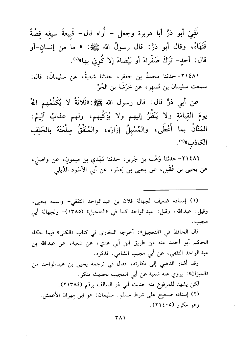 ٢١٤٨١ - حَدَّثَنَا مُحَمَّدُ بْنُ جَعْفَرٍ، حَدَّثَنَا شُعْبَةُ، عَنْ سُلَيْمَانَ، قَالَ: سَمِعْتُ سُلَيْمَانَ بْنَ مُسْهِرٍ، عَنْ خَرَشَةَ بْنِ الْحُرِّ، عَنْ أَبِي ذَرٍّ، قَالَ: قَالَ رَسُولُ اللهِ صَلَّى اللهُ عَلَيْهِ وَسَلَّمَ: "ثَلَاثَةٌ لَا يُكَلِّمُهُمُ اللهُ يَوْمَ الْقِيَامَةِ وَلَا يَنْظُرُ إِلَيْهِمْ وَلَا يُزَكِّيهِمْ، وَلَهُمْ عَذَابٌ أَلِيمٌ: الْمَنَّانُ بِمَا أَعْطَى، وَالْمُسْبِلُ إِزَارَهُ، وَالْمُنَفِّقُ سِلْعَتَهُ بِالْحَلِفِ الْكَاذِبِ " (٢)