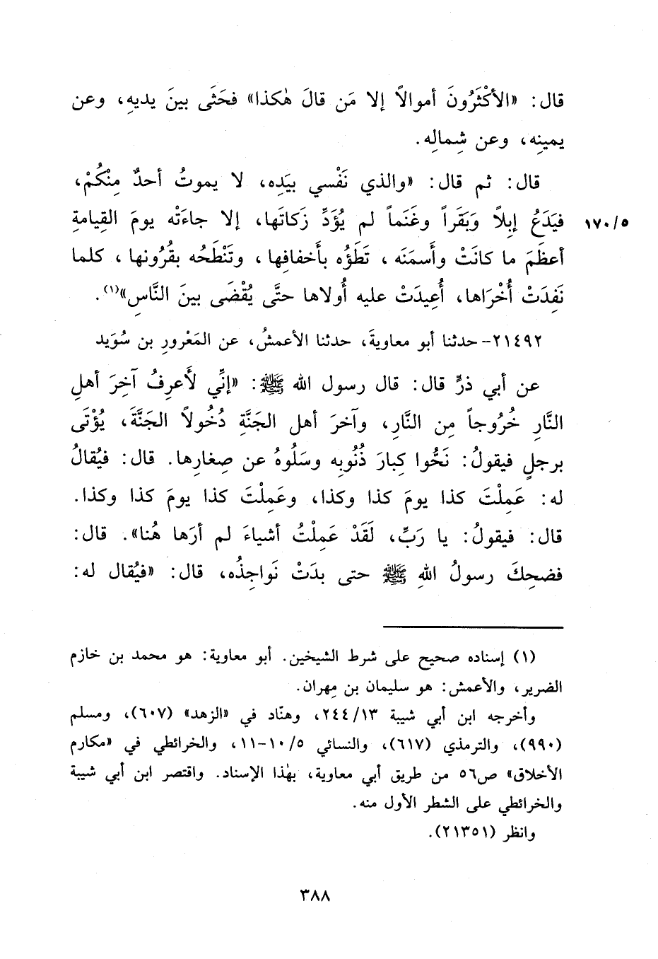 قَالَ: ثُمَّ قَالَ: "وَالَّذِي نَفْسِي بِيَدِهِ، لَا يَمُوتُ أَحَدٌ مِنْكُمْ، فَيَدَعُ إِبِلًا وَبَقَرًا وَغَنَمًا لَمْ يُؤَدِّ زَكَاتَهَا، إِلَّا جَاءَتْهُ يَوْمَ الْقِيَامَةِ أَعْظَمَ مَا كَانَتْ وَأَسْمَنَهُ، تَطَؤُهُ بِأَخْفَافِهَا، وَتَنْطَحُهُ بِقُرُونِهَا، كُلَّمَا نَفِدَتْ أُخْرَاهَا، أُعِيدَتْ عَلَيْهِ أُولَاهَا حَتَّى يُقْضَى بَيْنَ النَّاسِ " (١)
