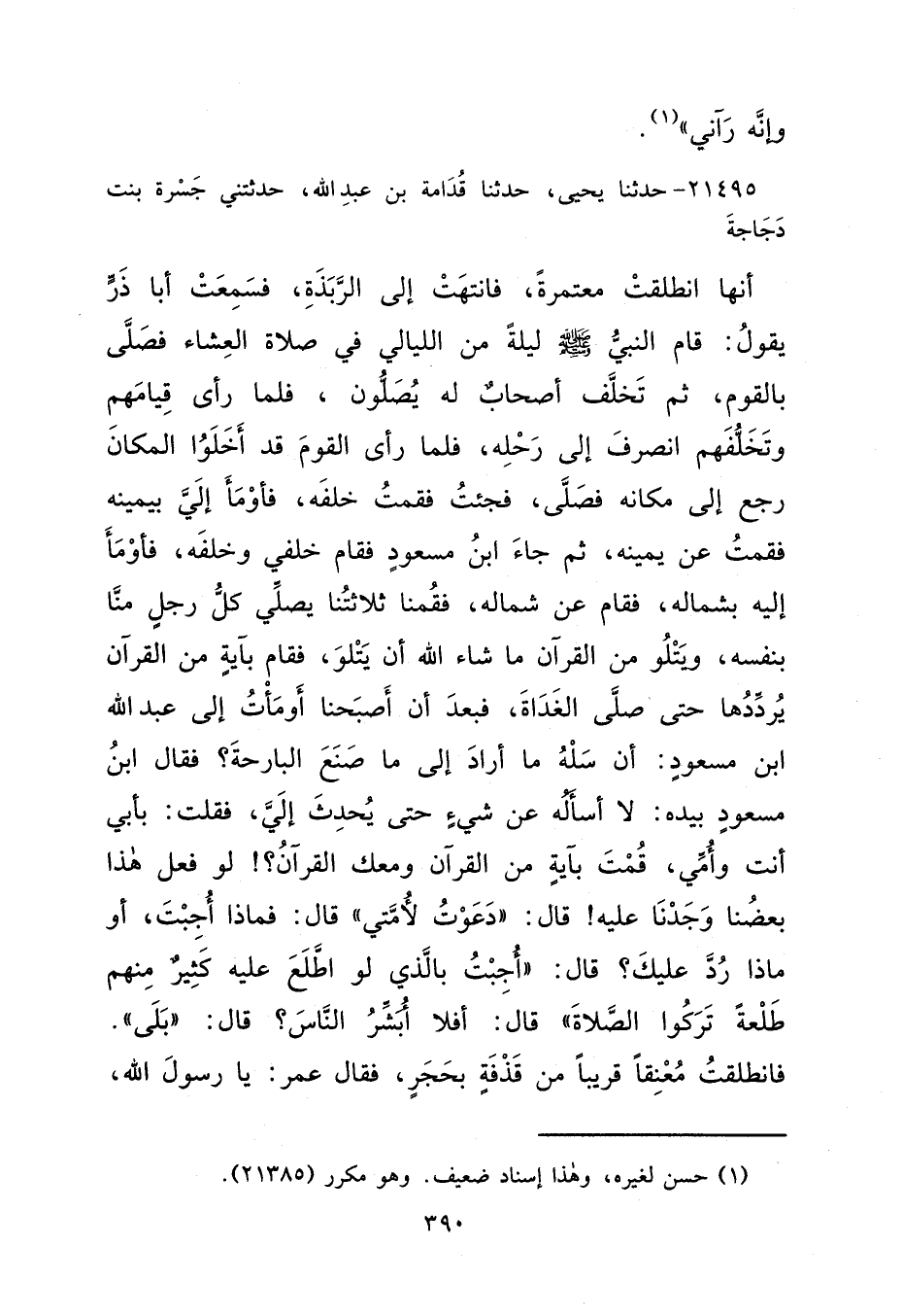 ٢١٤٩٥ - حَدَّثَنَا يَحْيَى، حَدَّثَنَا قُدَامَةُ بْنُ عَبْدِ اللهِ، حَدَّثَتْنِي جَسْرَةُ بِنْتُ دَجَاجَةَ، أَنَّهَا انْطَلَقَتْ مُعْتَمِرَةً، فَانْتَهَتْ إِلَى الرَّبَذَةِ، فَسَمِعَتْ أَبَا ذَرٍّ، يَقُولُ: قَامَ النَّبِيُّ صَلَّى اللهُ عَلَيْهِ وَسَلَّمَ لَيْلَةً مِنَ اللَّيَالِي فِي صَلَاةِ الْعِشَاءِ فَصَلَّى بِالْقَوْمِ، ثُمَّ تَخَلَّفَ أَصْحَابٌ لَهُ يُصَلُّونَ، فَلَمَّا رَأَى قِيَامَهُمْ وَتَخَلُّفَهُمْ انْصَرَفَ إِلَى رَحْلِهِ، فَلَمَّا رَأَى الْقَوْمَ قَدْ أَخْلَوْا الْمَكَانَ، رَجَعَ إِلَى مَكَانِهِ فَصَلَّى، فَجِئْتُ فَقُمْتُ خَلْفَهُ، فَأَوْمَأَ إِلَيَّ بِيَمِينِهِ فَقُمْتُ عَنْ يَمِينِهِ، ثُمَّ جَاءَ ابْنُ مَسْعُودٍ فَقَامَ خَلْفِي وَخَلْفَهُ، فَأَوْمَأَ إِلَيْهِ بِشِمَالِهِ، فَقَامَ عَنْ شِمَالِهِ، فَقُمْنَا ثَلَاثَتُنَا يُصَلِّي كُلُّ رَجُلٍ مِنَّا بِنَفْسِهِ، وَيَتْلُو مِنَ الْقُرْآنِ مَا شَاءَ اللهُ أَنْ يَتْلُوَ، فَقَامَ بِآيَةٍ مِنَ الْقُرْآنِ يُرَدِّدُهَا حَتَّى صَلَّى الْغَدَاةَ، فَبَعْدَ أَنْ أَصْبَحْنَا أَوْمَأْتُ إِلَى عَبْدِ اللهِ بْنِ مَسْعُودٍ: أَنْ سَلْهُ مَا أَرَادَ إِلَى مَا صَنَعَ الْبَارِحَةَ؟ فَقَالَ ابْنُ مَسْعُودٍ بِيَدِهِ: لَا أَسْأَلُهُ عَنْ شَيْءٍ حَتَّى يُحَدِّثَ إِلَيَّ، فَقُلْتُ: بِأَبِي أَنْتَ وَأُمِّي، قُمْتَ بِآيَةٍ مِنَ الْقُرْآنِ وَمَعَكَ الْقُرْآنُ؟ لَوْ فَعَلَ هَذَا بَعْضُنَا وَجَدْنَا عَلَيْهِ قَالَ: "دَعَوْتُ لِأُمَّتِي " قَالَ: فَمَاذَا أُجِبْتَ، أَوْ مَاذَا رُدَّ عَلَيْكَ؟ قَالَ: "أُجِبْتُ بِالَّذِي لَوْ اطَّلَعَ عَلَيْهِ كَثِيرٌ مِنْهُمْ طَلْعَةً تَرَكُوا الصَّلَاةَ " قَالَ: أَفَلَا أُبَشِّرُ النَّاسَ؟ قَالَ: "بَلَى ". فَانْطَلَقْتُ مُعْنِقًا قَرِيبًا مِنْ قَذْفَةٍ بِحَجَرٍ، فَقَالَ عُمَرُ: يَا رَسُولَ اللهِ،