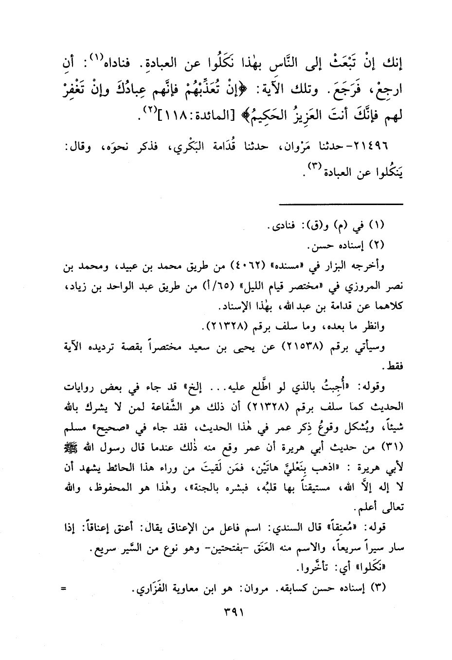 ٢١٤٩٦ - حَدَّثَنَا مَرْوَانُ، حَدَّثَنَا قُدَامَةُ الْبَكْرِيُّ، فَذَكَرَ نَحْوَهُ، وَقَالَ: "يَنْكُلُوا عَنِ الْعِبَادَةِ " (٣)