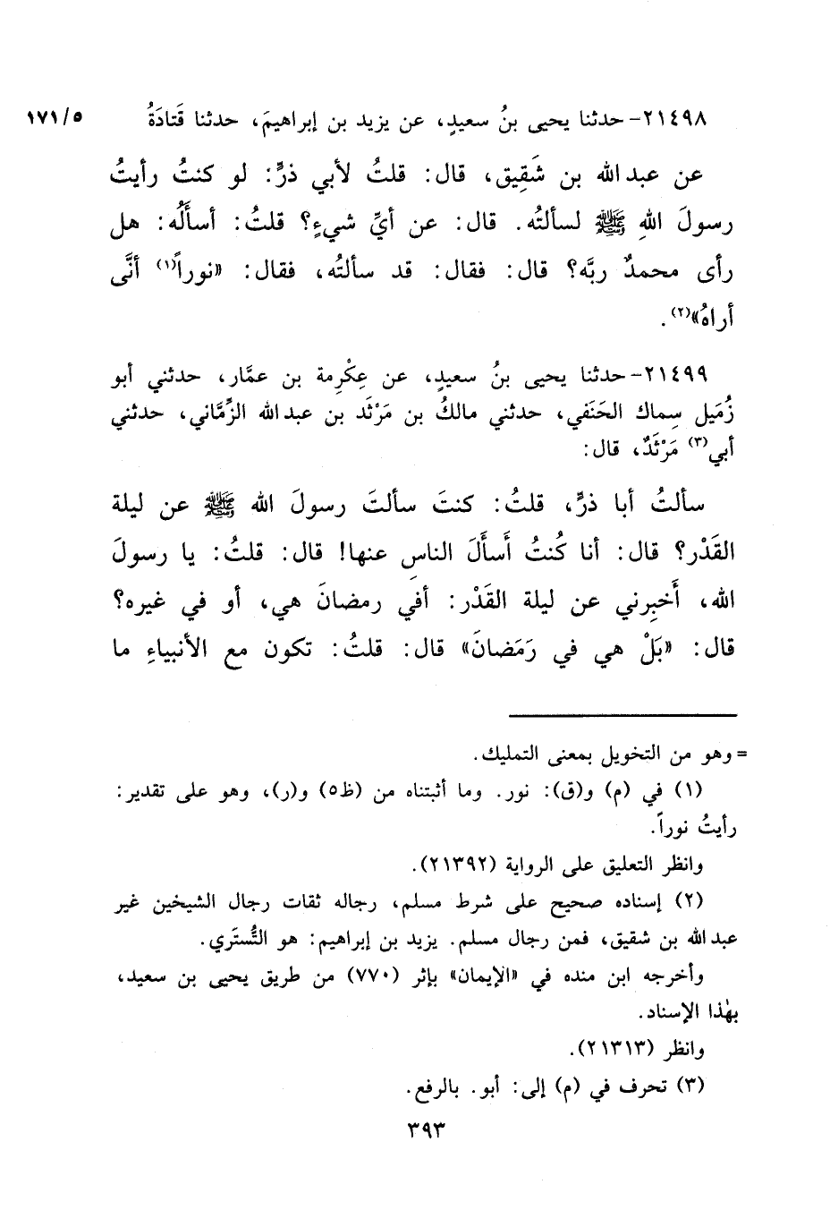 ٢١٤٩٨ - حَدَّثَنَا يَحْيَى بْنُ سَعِيدٍ، عَنْ يَزِيدَ بْنِ إِبْرَاهِيمَ، حَدَّثَنَا قَتَادَةُ، عَنْ عَبْدِ اللهِ بْنِ شَقِيقٍ، قَالَ: قُلْتُ لِأَبِي ذَرٍّ: لَوْ كُنْتُ رَأَيْتُ رَسُولَ اللهِ صَلَّى اللهُ عَلَيْهِ وَسَلَّمَ لَسَأَلْتُهُ. قَالَ: عَنْ أَيِّ شَيْءٍ؟ قُلْتُ: أَسْأَلُهُ: هَلْ رَأَى مُحَمَّدٌ رَبَّهُ؟ قَالَ: فَقَالَ: قَدْ سَأَلْتُهُ، فَقَالَ: "نُورًا (١) أَنَّى أَرَاهُ " (٢)