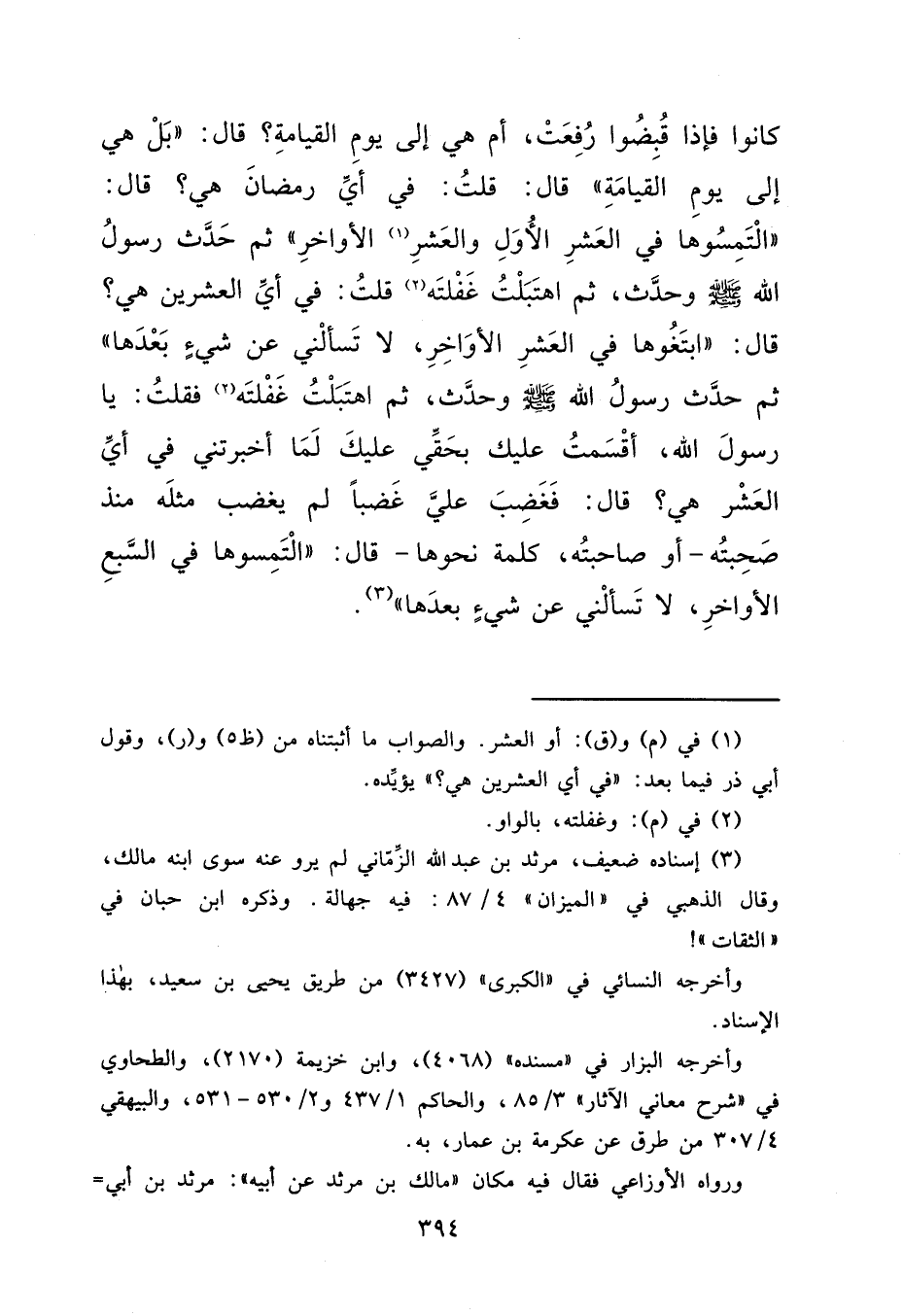 كَانُوا فَإِذَا قُبِضُوا رُفِعَتْ، أَمْ هِيَ إِلَى يَوْمِ الْقِيَامَةِ؟ قَالَ: "بَلْ هِيَ إِلَى يَوْمِ الْقِيَامَةِ " قَالَ: قُلْتُ: فِي أَيِّ رَمَضَانَ هِيَ؟ قَالَ: "الْتَمِسُوهَا فِي الْعَشْرِ الْأُوَلِ وَالْعَشْرِ (١) الْأَوَاخِرِ " ثُمَّ حَدَّثَ رَسُولُ اللهِ صَلَّى اللهُ عَلَيْهِ وَسَلَّمَ وَحَدَّثَ، ثُمَّ اهْتَبَلْتُ غَفْلَتَهُ (٢) قُلْتُ: فِي أَيِّ الْعِشْرِينَ هِيَ؟ قَالَ: "ابْتَغُوهَا فِي الْعَشْرِ الْأَوَاخِرِ، لَا تَسْأَلْنِي عَنْ شَيْءٍ بَعْدَهَا " ثُمَّ حَدَّثَ رَسُولُ اللهِ صَلَّى اللهُ عَلَيْهِ وَسَلَّمَ وَحَدَّثَ، ثُمَّ اهْتَبَلْتُ غَفْلَتَهُ فَقُلْتُ: يَا رَسُولَ اللهِ، أَقْسَمْتُ عَلَيْكَ بِحَقِّي عَلَيْكَ لَمَا أَخْبَرْتَنِي فِي أَيِّ الْعَشْرِ هِيَ؟ قَالَ: فَغَضِبَ عَلَيَّ غَضَبًا لَمْ يَغْضَبْ مِثْلَهُ مُنْذُ صَحِبْتُهُ، أَوْ صَاحَبْتُهُ، كَلِمَةً نَحْوَهَا، قَالَ: "الْتَمِسُوهَا فِي السَّبْعِ الْأَوَاخِرِ، لَا تَسْأَلْنِي عَنْ شَيْءٍ بَعْدَهَا " (٣)