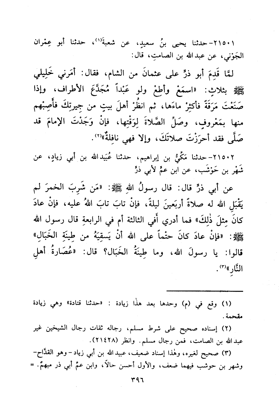 ٢١٥٠٢ - حَدَّثَنَا مَكِّيُّ بْنُ إِبْرَاهِيمَ، حَدَّثَنَا عُبَيْدُ اللهِ بْنُ أَبِي زِيَادٍ، عَنْ شَهْرِ بْنِ حَوْشَبٍ، عَنْ ابْنِ عَمٍّ لِأَبِي ذَرٍّ، عَنْ أَبِي ذَرٍّ، قَالَ: قَالَ رَسُولُ اللهِ صَلَّى اللهُ عَلَيْهِ وَسَلَّمَ: "مَنْ شَرِبَ الْخَمْرَ لَمْ يَقْبَلِ اللهُ لَهُ صَلَاةً أَرْبَعِينَ لَيْلَةً، فَإِنْ تَابَ تَابَ اللهُ عَلَيْهِ، فَإِنْ عَادَ كَانَ مِثْلَ ذَلِكَ، فَمَا أَدْرِي أَفِي الثَّالِثَةِ أَمْ فِي الرَّابِعَةِ قَالَ رَسُولُ اللهِ صَلَّى اللهُ عَلَيْهِ وَسَلَّمَ، فَإِنْ عَادَ كَانَ حَتْمًا عَلَى اللهِ أَنْ يَسْقِيَهُ مِنْ طِينَةِ الْخَبَالِ " قَالُوا: يَا رَسُولَ اللهِ، وَمَا طِينَةُ الْخَبَالِ؟ قَالَ: "عُصَارَةُ أَهْلِ النَّارِ " (٣)