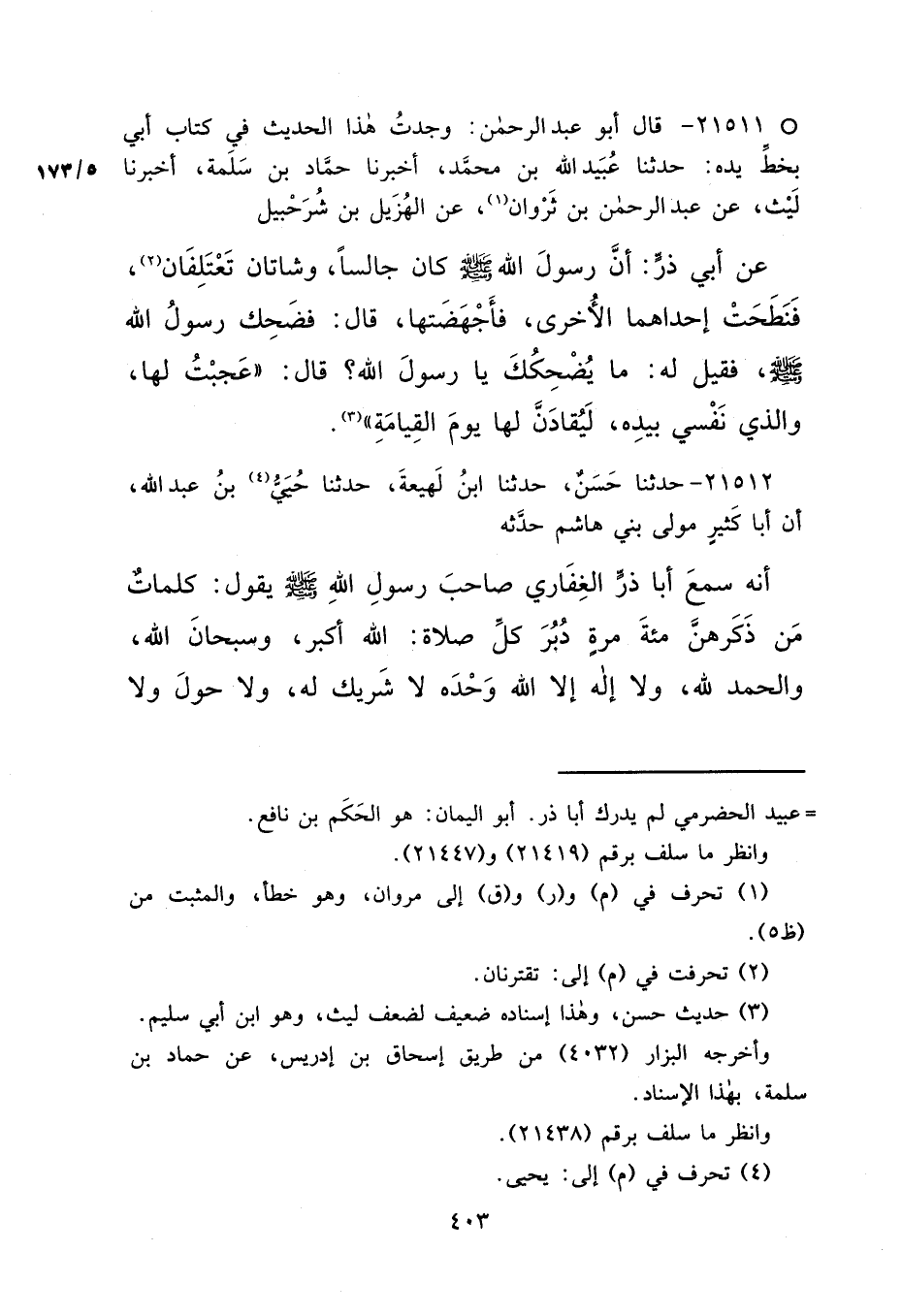 ° ٢١٥١١ - حَدَّثَنَا عُبَيْدُ اللهِ بْنُ مُحَمَّدٍ، أَخْبَرَنَا حَمَّادُ بْنُ سَلَمَةَ، أَخْبَرَنَا لَيْثٌ، عَنْ عَبْدِ الرَّحْمَنِ بْنِ ثَرْوَانَ (١) ، عَنْ الْهُزَيْلِ بْنِ شُرَحْبِيلَ، عَنْ أَبِي ذَرٍّ، أَنَّ رَسُولَ اللهِ صَلَّى اللهُ عَلَيْهِ وَسَلَّمَ كَانَ جَالِسًا، وَشَاتَانِ تَعْتلفَانِ (٢) ، فَنَطَحَتْ إِحْدَاهُمَا الْأُخْرَى، فَأَجْهَضَتْهَا، قَالَ: فَضَحِكَ رَسُولُ اللهِ صَلَّى اللهُ عَلَيْهِ وَسَلَّمَ، فَقِيلَ لَهُ: مَا يُضْحِكُكَ يَا رَسُولَ اللهِ؟ قَالَ: "عَجِبْتُ لَهَا، وَالَّذِي نَفْسِي بِيَدِهِ، لَيُقَادَنَّ لَهَا يَوْمَ الْقِيَامَةِ " (٣)