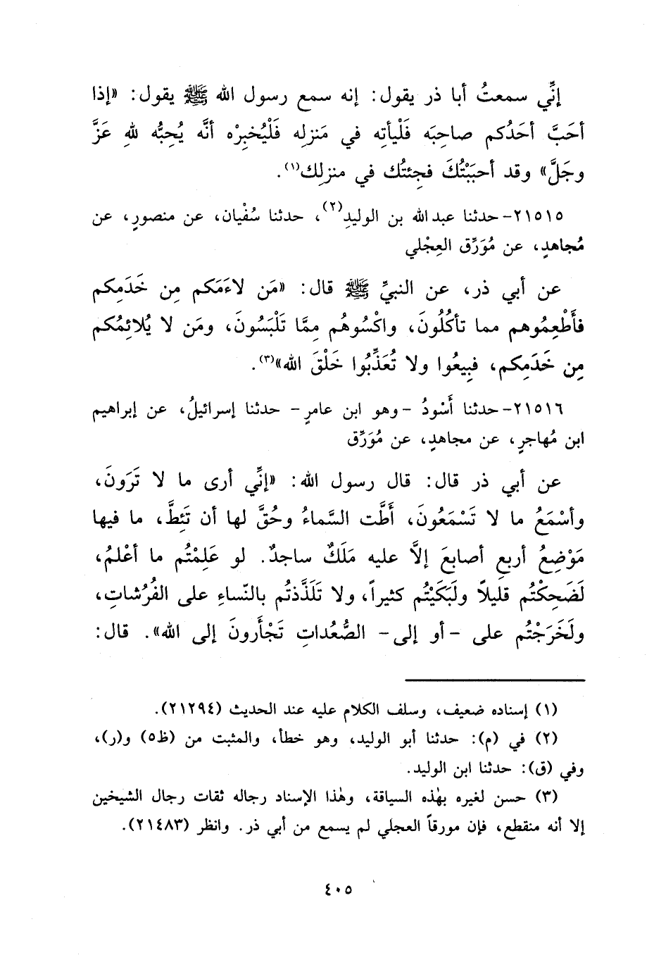 ٢١٥١٥ - حَدَّثَنَا عَبْدُ اللهِ بْنُ الْوَلِيدِ (٢) ، حَدَّثَنَا سُفْيَانُ، عَنْ مَنْصُورٍ، عَنْ مُجَاهِدٍ، عَنْ مُوَرِّقٍ الْعِجْلِيِّ، عَنْ أَبِي ذَرٍّ، عَنِ النَّبِيِّ صَلَّى اللهُ عَلَيْهِ وَسَلَّمَ قَالَ: "مَنْ لَاءَمَكُمْ مِنْ خَدَمِكُمْ فَأَطْعِمُوهُمْ مِمَّا تَأْكُلُونَ، وَاكْسُوهُمْ مِمَّا تَلْبَسُونَ، وَمَنْ لَا يُلَائِمُكُمْ مِنْ خَدَمِكُمْ، فَبِيعُوا، وَلَا تُعَذِّبُوا خَلْقَ اللهِ " (٣)