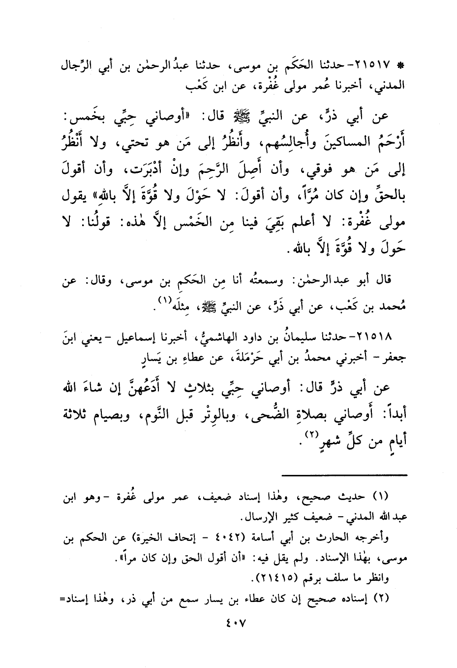 * ٢١٥١٧ - حَدَّثَنَا الْحَكَمُ بْنُ مُوسَى، حَدَّثَنَا عَبْدُ الرَّحْمَنِ بْنُ أَبِي الرِّجَالِ الْمَدَنِيُّ، أَخْبَرَنَا عُمَرُ، مَوْلَى غُفْرَةَ، عَنِ ابْنِ كَعْبٍ، عَنْ أَبِي ذَرٍّ، عَنِ النَّبِيِّ صَلَّى اللهُ عَلَيْهِ وَسَلَّمَ قَالَ: "أَوْصَانِي حِبِّي بِخَمْسٍ: أَرْحَمُ الْمَسَاكِينَ وَأُجَالِسُهُمْ، وَأَنْظُرُ إِلَى مَنْ هُوَ تَحْتِي، وَلَا أَنْظُرُ إِلَى مَنْ هُوَ فَوْقِي، وَأَنْ أَصِلَ الرَّحِمَ وَإِنْ أَدْبَرَتْ، وَأَنْ أَقُولَ بِالْحَقِّ وَإِنْ كَانَ مُرًّا، وَأَنْ أَقُولَ: لَا حَوْلَ وَلَا قُوَّةَ إِلَّا بِاللهِ " يَقُولُ مَوْلَى غُفْرَةَ: "لَا أَعْلَمُ بَقِيَ فِينَا مِنَ الْخَمْسِ إِلَّا هَذِهِ: قَوْلُنَا: لَا حَوْلَ وَلَا قُوَّةَ إِلَّا بِاللهِ " قَالَ أَبُو عَبْدِ الرَّحْمَنِ: وَسَمِعْتُهُ أَنَا مِنَ الْحَكَمِ بْنِ مُوسَى، وقَالَ: عَنْ مُحَمَّدِ بْنِ كَعْبٍ، عَنْ أَبِي ذَرٍّ، عَنِ النَّبِيِّ صَلَّى اللهُ عَلَيْهِ وَسَلَّمَ، مِثْلَهُ (١)