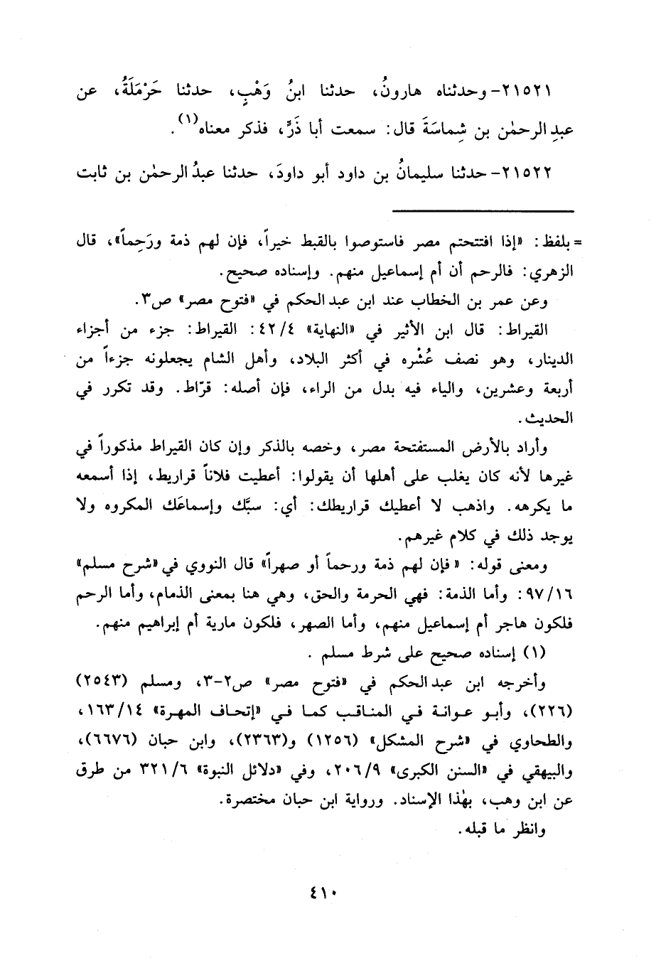 =بلفظ: "إذا افتتحتم مصر فاستوصوا بالقبط خيراً، فإن لهم ذمة ورَحِماً"، قال الزهري: فالرحم أن أم إسماعيل منهم. وإسناده صحيح.
