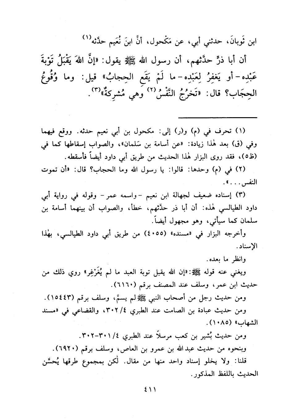 بْنِ ثَوْبَانَ، حَدَّثَنِي أَبِي، عَنْ مَكْحُولٍ، عَنِ ابْنِ نُعَيْمٍ، حَدَّثَهُ (١) ، أَنَّ أَبَا ذَرٍّ، حَدَّثَهُمْ، أَنَّ رَسُولَ اللهِ صَلَّى اللهُ عَلَيْهِ وَسَلَّمَ يَقُولُ: "إِنَّ اللهَ يَقْبَلُ تَوْبَةَ عَبْدِهِ، أَوْ يَغْفِرُ لِعَبْدِهِ، مَا لَمْ يَقَعِ الْحِجَابُ " قِيلَ: وَمَا وُقُوعٌ الْحِجَابِ؟ قَالَ: "تَخْرُجُ النَّفْسُ (٢) ، وَهِيَ مُشْرِكَةٌ " (٣)