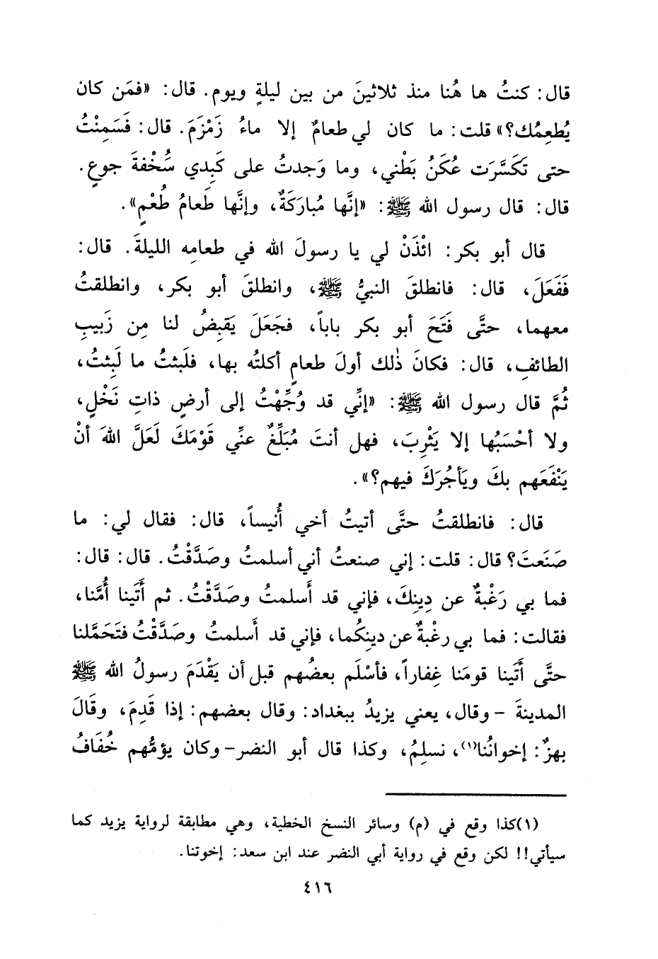 قَالَ: كُنْتُ هَاهُنَا مُنْذُ ثَلَاثِينَ مِنْ بَيْنِ لَيْلَةٍ وَيَوْمٍ. قَالَ: "فَمَنْ كَانَ يُطْعِمُكَ؟ " قُلْتُ: مَا كَانَ لِي طَعَامٌ إِلَّا مَاءُ زَمْزَمَ. قَالَ: فَسَمِنْتُ حَتَّى تَكَسَّرَتْ عُكَنُ بَطْنِي، وَمَا وَجَدْتُ عَلَى كَبِدِي سُخْفَةَ جُوعٍ. قَالَ: قَالَ رَسُولُ اللهِ صَلَّى اللهُ عَلَيْهِ وَسَلَّمَ: "إِنَّهَا مُبَارَكَةٌ، وَإِنَّهَا طَعَامُ طُعْمٍ ". قَالَ أَبُو بَكْرٍ: ائْذَنْ لِي يَا رَسُولَ اللهِ فِي طَعَامِهِ اللَّيْلَةَ. قَالَ: فَفَعَلَ، قَالَ: فَانْطَلَقَ النَّبِيُّ صَلَّى اللهُ عَلَيْهِ وَسَلَّمَ، وَانْطَلَقَ أَبُو بَكْرٍ، وَانْطَلَقْتُ مَعَهُمَا، حَتَّى فَتَحَ أَبُو بَكْرٍ بَابًا، فَجَعَلَ يَقْبِضُ لَنَا مِنْ زَبِيبِ الطَّائِفِ، قَالَ: فَكَانَ ذَلِكَ أَوَّلَ طَعَامٍ أَكَلْتُهُ بِهَا، فَلَبِثْتُ مَا لَبِثْتُ، ثُمَّ قَالَ رَسُولُ اللهِ صَلَّى اللهُ عَلَيْهِ وَسَلَّمَ: "إِنِّي قَدْ وُجِّهَتْ إِلَيَّ أَرْضٌ ذَاتُ نَخْلٍ، وَلَا أَحْسَبُهَا إِلَّا يَثْرِبَ، فَهَلْ أَنْتَ مُبَلِّغٌ عَنِّي قَوْمَكَ لَعَلَّ اللهَ أَنْ يَنْفَعَهُمْ بِكَ وَيَأْجُرَكَ فِيهِمْ؟ " قَالَ: فَانْطَلَقْتُ حَتَّى أَتَيْتُ أَخِي أُنَيْسًا، قَالَ: فَقَالَ لِي: مَا صَنَعْتَ؟ قَالَ: قُلْتُ: إِنِّي صَنَعْتُ أَنِّي أَسْلَمْتُ وَصَدَّقْتُ. قَالَ: قَالَ: فَمَا بِي رَغْبَةٌ عَنْ دِينِكَ، فَإِنِّي قَدْ أَسْلَمْتُ وَصَدَّقْتُ. ثُمَّ أَتَيْنَا أُمَّنَا، فَقَالَتْ: فَمَا بِي رَغْبَةٌ عَنْ دِينِكُمَا، فَإِنِّي قَدْ أَسْلَمْتُ وَصَدَّقْتُ فَتَحَمَّلْنَا حَتَّى أَتَيْنَا قَوْمَنَا غِفَارًا، فَأَسْلَمَ بَعْضُهُمْ قَبْلَ أَنْ يَقْدَمَ رَسُولُ اللهِ صَلَّى اللهُ عَلَيْهِ وَسَلَّمَ الْمَدِينَةَ، وَقَالَ، يَعْنِي يَزِيدَ بِبَغْدَادَ: وَقَالَ بَعْضُهُمْ: إِذَا قَدِمَ، وَقَالَ بَهْزٌ: إِخْوَانُنَا، (١) نُسْلِمُ، وَكَذَا قَالَ أَبُو النَّضْرِ، وَكَانَ يَؤُمُّهُمْ خُفَافُ