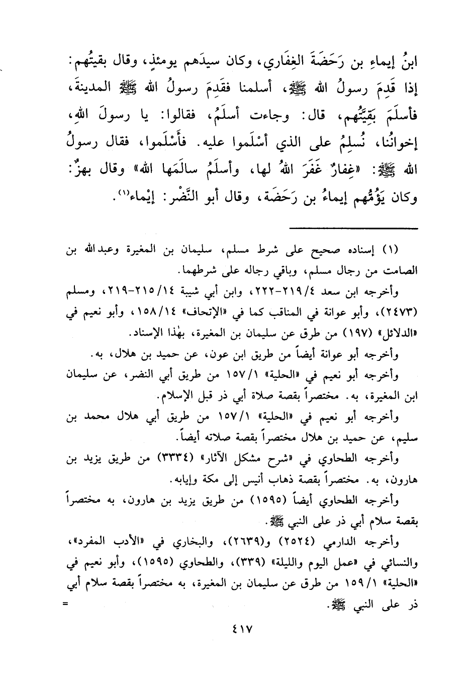 بْنُ إِيمَاءِ بْنِ رَحَضَةَ الْغِفَارِيُّ، وَكَانَ سَيِّدَهُمْ يَوْمَئِذٍ، وَقَالَ بَقِيَّتُهُمْ: إِذَا قَدِمَ رَسُولُ اللهِ صَلَّى اللهُ عَلَيْهِ وَسَلَّمَ أَسْلَمْنَا، فَقَدِمَ رَسُولُ اللهِ صَلَّى اللهُ عَلَيْهِ وَسَلَّمَ الْمَدِينَةَ، فَأَسْلَمَ بَقِيَّتُهُمْ، قَالَ: وَجَاءَتْ أَسْلَمُ، فَقَالُوا: يَا رَسُولَ اللهِ، إِخْوَانُنَا، نُسْلِمُ عَلَى الَّذِي أَسْلَمُوا عَلَيْهِ. فَأَسْلَمُوا، فَقَالَ رَسُولُ اللهِ صَلَّى اللهُ عَلَيْهِ وَسَلَّمَ: "غِفَارٌ غَفَرَ اللهُ لَهَا، وَأَسْلَمُ سَالَمَهَا اللهُ " وَقَالَ بَهْزٌ: وَكَانَ يَؤُمُّهُمْ إِيمَاءُ بْنُ رَحَضَةَ، وَقَالَ أَبُو النَّضْرِ: إِيمَاءٌ، (١)
