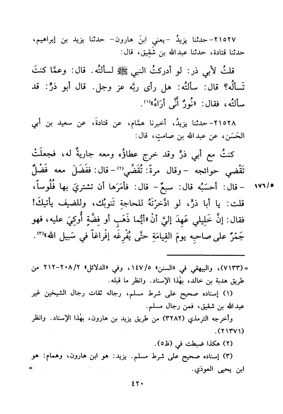 ٢١٥٢٧ - حَدَّثَنَا يَزِيدُ يَعْنِي ابْنَ هَارُونَ، حَدَّثَنَا يَزِيدُ بْنُ إِبْرَاهِيمَ، حَدَّثَنَا قَتَادَةُ، حَدَّثَنَا عَبْدُ اللهِ بْنُ شَقِيقٍ، قَالَ: قُلْتُ لِأَبِي ذَرٍّ: لَوْ أَدْرَكْتُ النَّبِيَّ صَلَّى اللهُ عَلَيْهِ وَسَلَّمَ لَسَأَلْتُهُ. قَالَ: وَعَمَّا كُنْتَ تَسْأَلُهُ؟ قَالَ: سَأَلْتُهُ هَلْ رَأَى رَبَّهُ عَزَّ وَجَلَّ؟ قَالَ أَبُو ذَرٍّ: قَدْ سَأَلْتُهُ، فَقَالَ: "نُورٌ أَنَّى أَرَاهُ " (١)