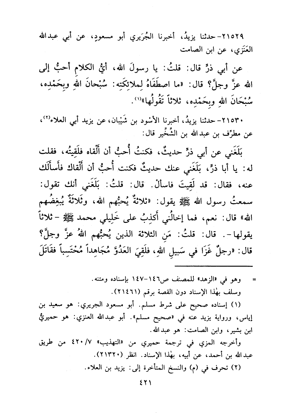 ٢١٥٣٠ - حَدَّثَنَا يَزِيدُ، أَخْبَرَنَا الْأَسْوَدُ بْنُ شَيْبَانَ، عَنْ يَزِيدَ أَبِي الْعَلَاءِ (٢) ، عَنْ مُطَرِّفِ بْنِ عَبْدِ اللهِ بْنِ الشِّخِّيرِ، قَالَ: بَلَغَنِي عَنْ أَبِي ذَرٍّ، حَدِيثٌ، فَكُنْتُ أُحِبُّ أَنْ أَلْقَاهُ فَلَقِيتُهُ، فَقُلْتُ لَهُ: يَا أَبَا ذَرٍّ، بَلَغَنِي عَنْكَ حَدِيثٌ فَكُنْتُ أُحِبُّ أَنْ أَلْقَاكَ فَأَسْأَلَكَ عَنْهُ، فَقَالَ: قَدْ لَقِيتَ فَاسْأَلْ. قَالَ: قُلْتُ: بَلَغَنِي أَنَّكَ تَقُولُ: سَمِعْتُ رَسُولَ اللهِ صَلَّى اللهُ عَلَيْهِ وَسَلَّمَ يَقُولُ: "ثَلَاثَةٌ يُحِبُّهُمُ اللهُ، وَثَلَاثَةٌ يُبْغِضُهُمُ اللهُ " قَالَ: نَعَمْ، فَمَا أَخَالُنِي أَكْذِبُ عَلَى خَلِيلِي مُحَمَّدٍ صَلَّى اللهُ عَلَيْهِ وَسَلَّمَ، ثَلَاثًا يَقُولُهَا، قَالَ: قُلْتُ: مَنِ الثَّلَاثَةُ الَّذِينَ يُحِبُّهُمُ اللهُ عَزَّ وَجَلَّ؟ قَالَ: رَجُلٌ غَزَا فِي سَبِيلِ اللهِ، فَلَقِيَ الْعَدُوَّ مُجَاهِدًا مُحْتَسِبًا فَقَاتَلَ
