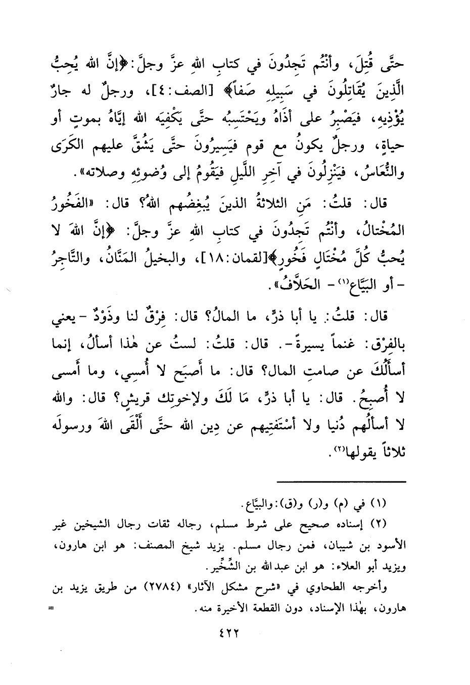 حَتَّى قُتِلَ، وَأَنْتُمْ تَجِدُونَ فِي كِتَابِ اللهِ عَزَّ وَجَلَّ: {إِنَّ اللهَ يُحِبُّ الَّذِينَ يُقَاتِلُونَ فِي سَبِيلِهِ صَفًّا} [الصف: ٤] ، وَرَجُلٌ لَهُ جَارٌ يُؤْذِيهِ، فَيَصْبِرُ عَلَى أَذَاهُ وَيَحْتَسِبُهُ حَتَّى يَكْفِيَهُ اللهُ إِيَّاهُ بِمَوْتٍ أَوْ حَيَاةٍ، وَرَجُلٌ يَكُونُ مَعَ قَوْمٍ فَيَسِيرُونَ حَتَّى يَشُقَّ عَلَيْهِمُ الْكَرَى وَالنُّعَاسُ، فَيَنْزِلُونَ فِي آخِرِ اللَّيْلِ فَيَقُومُ إِلَى وُضُوئِهِ وَصَلَاتِهِ " قَالَ: قُلْتُ: مَنِ الثَّلَاثَةُ الَّذِينَ يُبْغِضُهُمُ اللهُ؟ قَالَ: "الْفَخُورُ الْمُخْتَالُ، وَأَنْتُمْ تَجِدُونَ فِي كِتَابِ اللهِ عَزَّ وَجَلَّ: {إِنَّ اللهَ لَا يُحِبُّ كُلَّ مُخْتَالٍ فَخُورٍ} [لقمان: ١٨] ، وَالْبَخِيلُ الْمَنَّانُ، وَالتَّاجِرُ أَوِ الْبَيَّاعُ (١) الْحَلَّافُ " قَالَ: قُلْتُ: يَا أَبَا ذَرٍّ، مَا الْمَالُ؟ قَالَ: فِرْقٌ لَنَا وَذَوْدٌ، يَعْنِي بِالْفِرْقِ: غَنَمًا يَسِيرَةً، قَالَ: قُلْتُ: لَسْتُ عَنْ هَذَا أَسْأَلُ، إِنَّمَا أَسْأَلُكَ عَنْ صَامِتِ الْمَالِ؟ قَالَ: مَا أَصْبَحَ لَا أَمْسَى، وَمَا أَمْسَى لَا أَصْبَحَ. قَالَ: قُلْتُ: يَا أَبَا ذَرٍّ، مَا لَكَ وَلِإِخْوَتِكَ قُرَيْشٍ؟ قَالَ: وَاللهِ لَا أَسْأَلُهُمْ دُنْيَا وَلَا أَسْتَفْتِيهِمْ عَنْ دِينِ اللهِ حَتَّى أَلْقَى اللهَ وَرَسُولَهُ ثَلَاثًا يَقُولُهَا (٢)