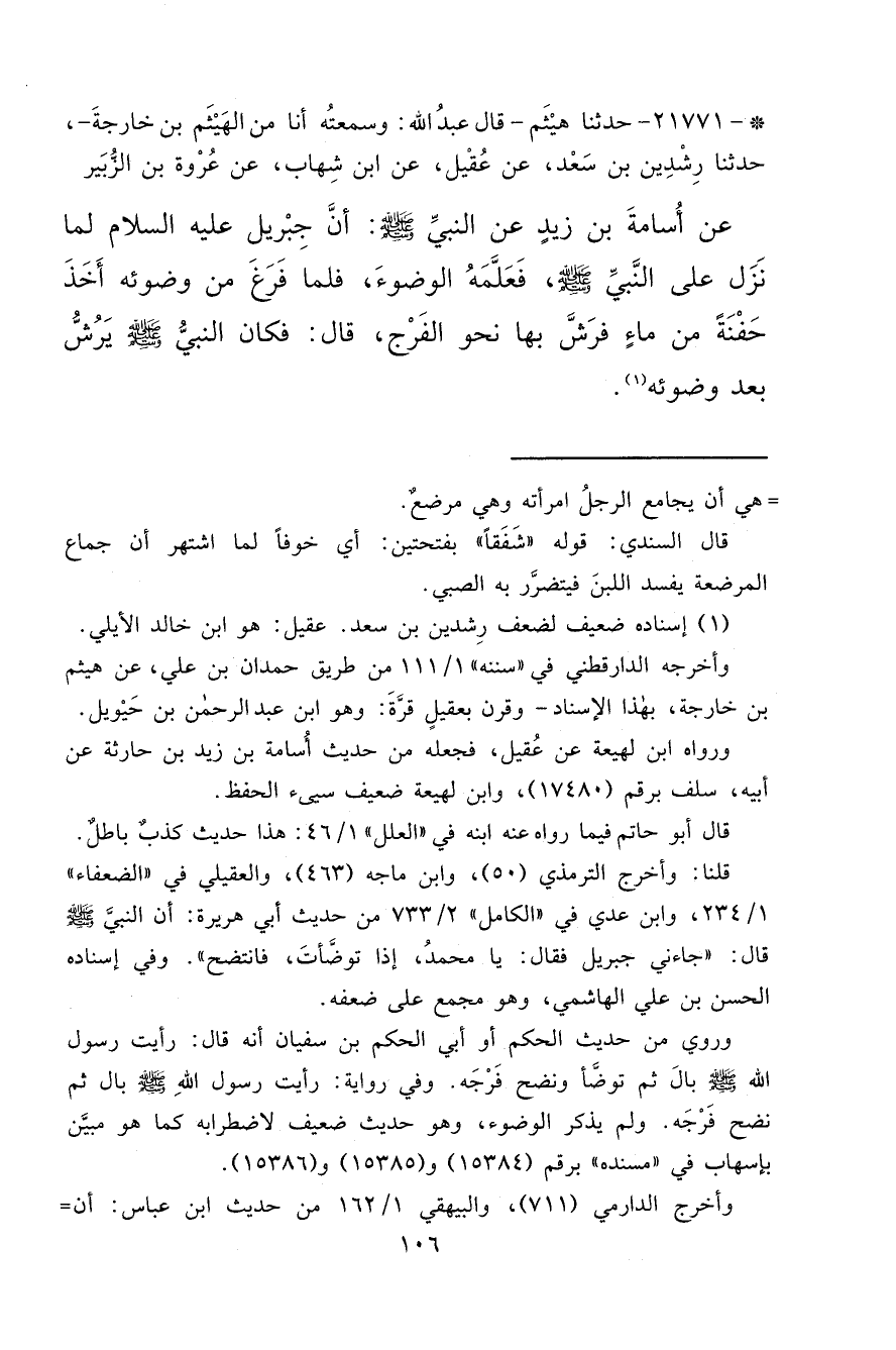 * ٢١٧٧١ - حَدَّثَنَا هَيْثَمٌ، قَالَ: عَبْدُ اللهِ: وَسَمِعْتُهُ أَنَا مِنَ الْهَيْثَمِ بْنِ خَارِجَةَ، حَدَّثَنَا رِشْدِينُ بْنُ سَعْدٍ، عَنْ عُقَيْلٍ، عَنِ ابْنِ شِهَابٍ، عَنْ عُرْوَةَ بْنِ الزُّبَيْرِ، عَنْ أُسَامَةَ بْنِ زَيْدٍ، عَنِ النَّبِيِّ صَلَّى اللهُ عَلَيْهِ وَسَلَّمَ: أَنَّ جِبْرِيلَ عَلَيْهِ السَّلَامُ لَمَّا نَزَلَ عَلَى النَّبِيِّ صَلَّى اللهُ عَلَيْهِ وَسَلَّمَ، فَعَلَّمَهُ الْوُضُوءَ، فَلَمَّا فَرَغَ مِنْ وُضُوئِهِ أَخَذَ حَفْنَةً مِنْ مَاءٍ فَرَشَّ بِهَا نَحْوَ الْفَرْجِ، قَالَ: " فَكَانَ النَّبِيُّ صَلَّى اللهُ عَلَيْهِ وَسَلَّمَ يَرُشُّ بَعْدَ وُضُوئِهِ " (١)
