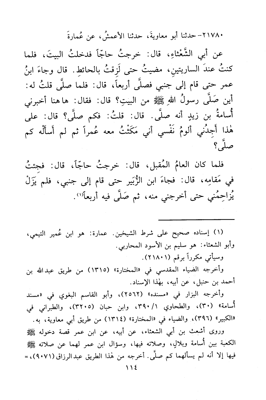 ٢١٧٨٠ - حَدَّثَنَا أَبُو مُعَاوِيَةَ، حَدَّثَنَا الْأَعْمَشُ، عَنْ عُمَارَةَ، عَنْ أَبِي الشَّعْثَاءِ، قَالَ: خَرَجْتُ حَاجًّا فَدَخَلْتُ الْبَيْتَ، فَلَمَّا كُنْتُ عِنْدَ السَّارِيَتَيْنِ، مَضَيْتُ حَتَّى لَزِقْتُ بِالْحَائِطِ. قَالَ: وَجَاءَ ابْنُ عُمَرَ، حَتَّى قَامَ إِلَى جَنْبِي فَصَلَّى أَرْبَعًا، قَالَ: فَلَمَّا صَلَّى قُلْتُ لَهُ: " أَيْنَ صَلَّى رَسُولُ اللهِ صَلَّى اللهُ عَلَيْهِ وَسَلَّمَ مِنَ الْبَيْتِ؟ قَالَ: فَقَالَ: هَاهُنَا أَخْبَرَنِي أُسَامَةُ بْنُ زَيْدٍ، أَنَّهُ صَلَّى ". قَالَ: قُلْتُ: فَكَمْ صَلَّى؟ قَالَ: عَلَى هَذَا أَجِدُنِي أَلُومُ نَفْسِي أَنِّي مَكَثْتُ مَعَهُ عُمُرًا ثُمَّ لَمْ أَسْأَلْهُ كَمْ صَلَّى؟ فَلَمَّا كَانَ الْعَامُ الْمُقْبِلُ، قَالَ: خَرَجْتُ حَاجًّا، قَالَ: فَجِئْتُ فِي مَقَامِهِ، قَالَ: فَجَاءَ ابْنُ الزُّبَيْرِ، حَتَّى قَامَ إِلَى جَنْبِي، فَلَمْ يَزَلْ يُزَاحِمُنِي حَتَّى أَخْرَجَنِي مِنْهُ، ثُمَّ صَلَّى فِيهِ أَرْبَعًا (١)