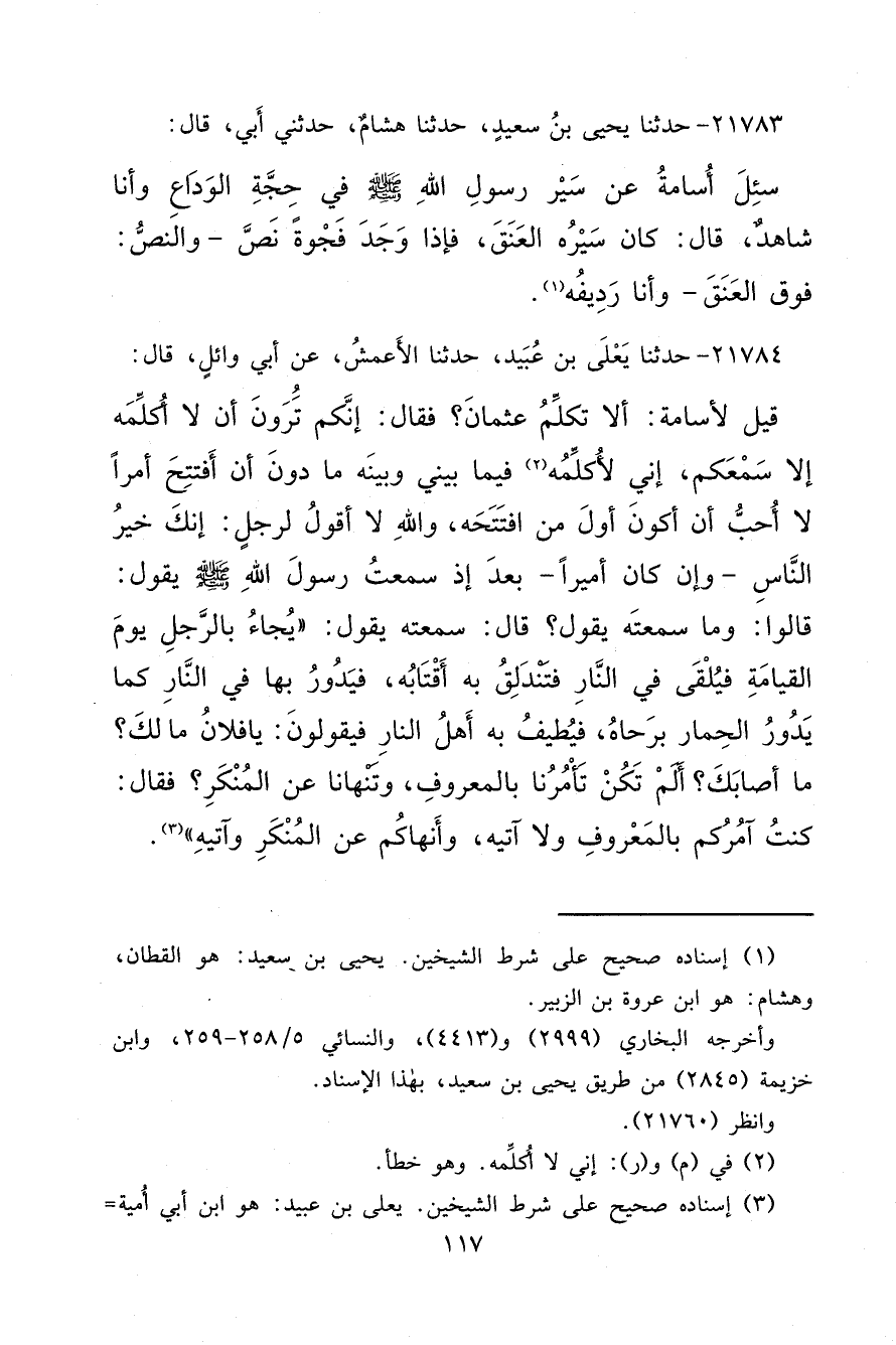 ٢١٧٨٤ - حَدَّثَنَا يَعْلَى بْنُ عُبَيْدٍ، حَدَّثَنَا الْأَعْمَشُ، عَنْ أَبِي وَائِلٍ، قَالَ: قِيلَ لِأُسَامَةَ: أَلَا تُكَلِّمُ عُثْمَانَ؟ فَقَالَ: إِنَّكُمْ تَرَوْنَ أَنْ لَا أُكَلِّمَهُ إِلَّا سَمْعَكُمْ، إِنِّي لَأُكَلِّمُهُ (٢) فِيمَا بَيْنِي وَبَيْنَهُ مَا دُونَ أَنْ أَفْتَتِحَ أَمْرًا لَا أُحِبُّ أَنْ أَكُونَ أَوَّلَ مَنْ افْتَتَحَهُ، وَاللهِ لَا أَقُولُ لِرَجُلٍ: إِنَّكَ خَيْرُ النَّاسِ، وَإِنْ كَانَ أَمِيرًا بَعْدَ إِذْ سَمِعْتُ رَسُولَ اللهِ صَلَّى اللهُ عَلَيْهِ وَسَلَّمَ يَقُولُ: قَالُوا: وَمَا سَمِعْتَهُ يَقُولُ؟ قَالَ: سَمِعْتُهُ يَقُولُ: " يُجَاءُ بِالرَّجُلِ يَوْمَ الْقِيَامَةِ فَيُلْقَى فِي النَّارِ فَتَنْدَلِقُ بِهِ أَقْتَابُهُ، فَيَدُورُ بِهَا فِي النَّارِ كَمَا يَدُورُ الْحِمَارُ بِرَحَاهُ، فَيُطِيفُ بِهِ أَهْلُ النَّارِ فَيَقُولُونَ: يَا فُلَانُ مَا لَكَ؟ مَا أَصَابَكَ؟ أَلَمْ تَكُنْ تَأْمُرُنَا بِالْمَعْرُوفِ، وَتَنْهَانَا عَنِ الْمُنْكَرِ؟ فَقَالَ: كُنْتُ آمُرُكُمْ بِالْمَعْرُوفِ وَلَا آتِيهِ، وَأَنْهَاكُمْ عَنِ الْمُنْكَرِ وَآتِيهِ " (٣)