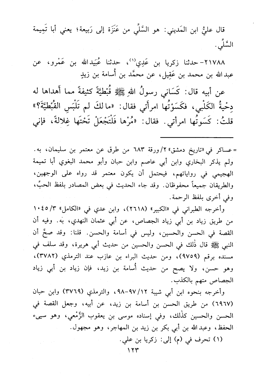 ٢١٧٨٨ - حَدَّثَنَا زَكَرِيَّا بْنُ عَدِيٍّ، (١) حَدَّثَنَا عُبَيْدُ اللهِ بْنُ عَمْرٍو، عَنْ عَبْدِ اللهِ بْنِ مُحَمَّدِ بْنِ عَقِيلٍ، عَنْ مُحَمَّدِ بْنِ أُسَامَةَ بْنِ زَيْدٍ، عَنْ أَبِيهِ، قَالَ: كَسَانِي رَسُولُ اللهِ صَلَّى اللهُ عَلَيْهِ وَسَلَّمَ قُبْطِيَّةً كَثِيفَةً مِمَّا أَهْدَاهَا لَهُ دِحْيَةُ الْكَلْبِيُّ، فَكَسَوْتُهَا امْرَأَتِي فَقَالَ: " مَا لَكَ لَمْ تَلْبَسِ الْقُبْطِيَّةَ " قُلْتُ: كَسَوْتُهَا امْرَأَتِي. فَقَالَ: " مُرْهَا فَلْتَجْعَلْ تَحْتَهَا غِلَالَةً، فَإِنِّي