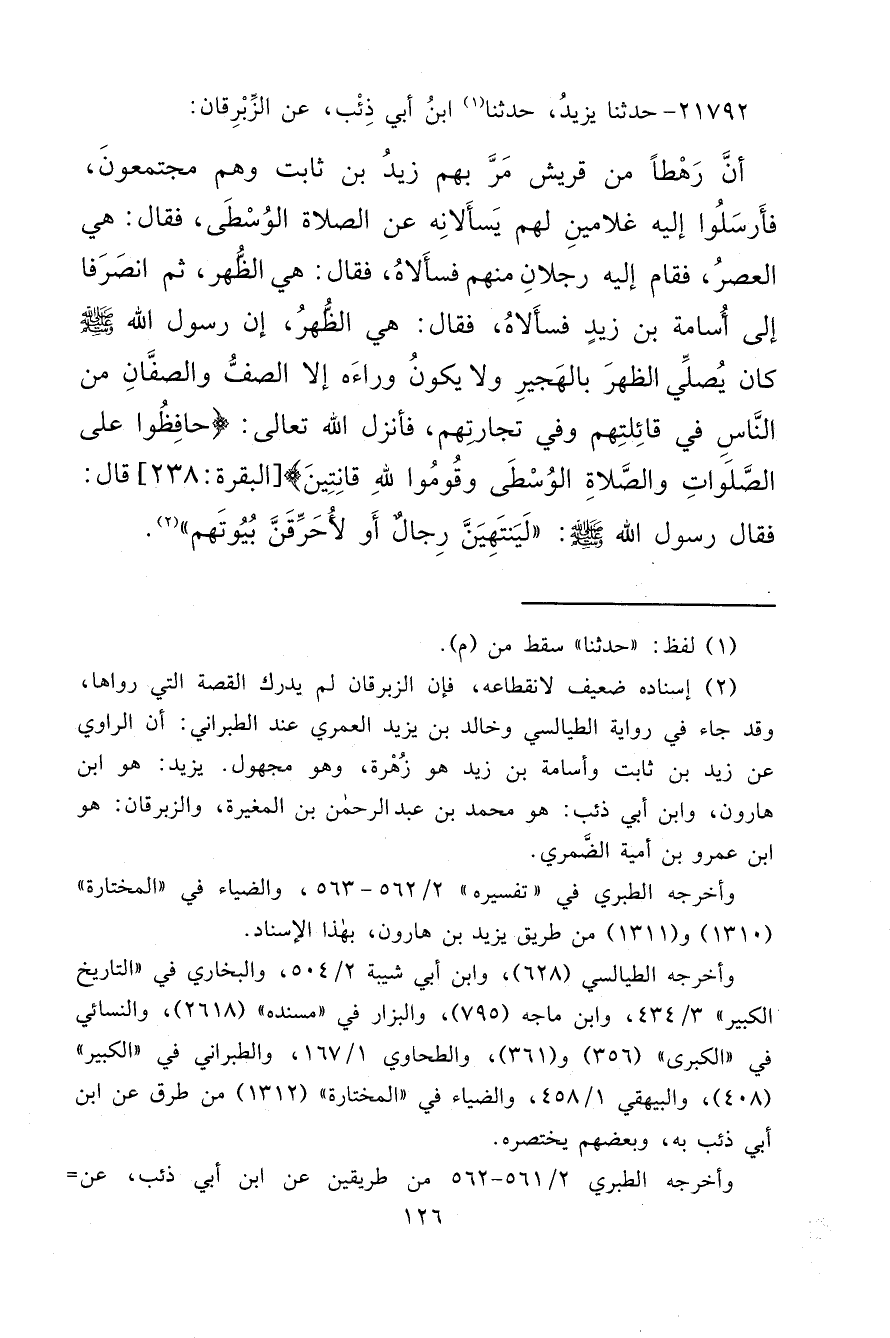 ٢١٧٩٢ - حَدَّثَنَا يَزِيدُ، حَدَّثَنَا (١) ابْنِ أَبِي ذِئْبٍ، عَنِ الزِّبْرِقَانِ: أَنَّ رَهْطًا مِنْ قُرَيْشٍ مَرَّ بِهِمْ زَيْدُ بْنُ ثَابِتٍ، وَهُمْ مُجْتَمِعُونَ، فَأَرْسَلُوا إِلَيْهِ غُلَامَيْنِ لَهُمْ يَسْأَلَانِهِ عَنِ الصَّلَاةِ الْوُسْطَى، فَقَالَ: هِيَ الْعَصْرُ، فَقَامَ إِلَيْهِ رَجُلَانِ مِنْهُمْ فَسَأَلَاهُ، فَقَالَ: هِيَ الظُّهْرُ، ثُمَّ انْصَرَفَا إِلَى أُسَامَةَ بْنِ زَيْدٍ، فَسَأَلَاهُ، فَقَالَ: هِيَ الظُّهْرُ، إِنَّ رَسُولَ اللهِ صَلَّى اللهُ عَلَيْهِ وَسَلَّمَ كَانَ يُصَلِّي الظُّهْرَ بِالْهَجِيرِ وَلَا يَكُونُ وَرَاءَهُ إِلَّا الصَّفُّ وَالصَّفَّانِ مِنَ النَّاسِ فِي قَائِلَتِهِمْ وَفِي تِجَارَتِهِمْ، فَأَنْزَلَ اللهُ تَعَالَى: {حَافِظُوا عَلَى الصَّلَوَاتِ وَالصَّلَاةِ الْوُسْطَى وَقُومُوا لِلَّهِ قَانِتِينَ} [البقرة: ٢٣٨] قَالَ: فَقَالَ رَسُولُ اللهِ صَلَّى اللهُ عَلَيْهِ وَسَلَّمَ: " لَيَنْتَهِيَنَّ رِجَالٌ أَوْ لَأُحَرِّقَنَّ بُيُوتَهُمْ " (٢)