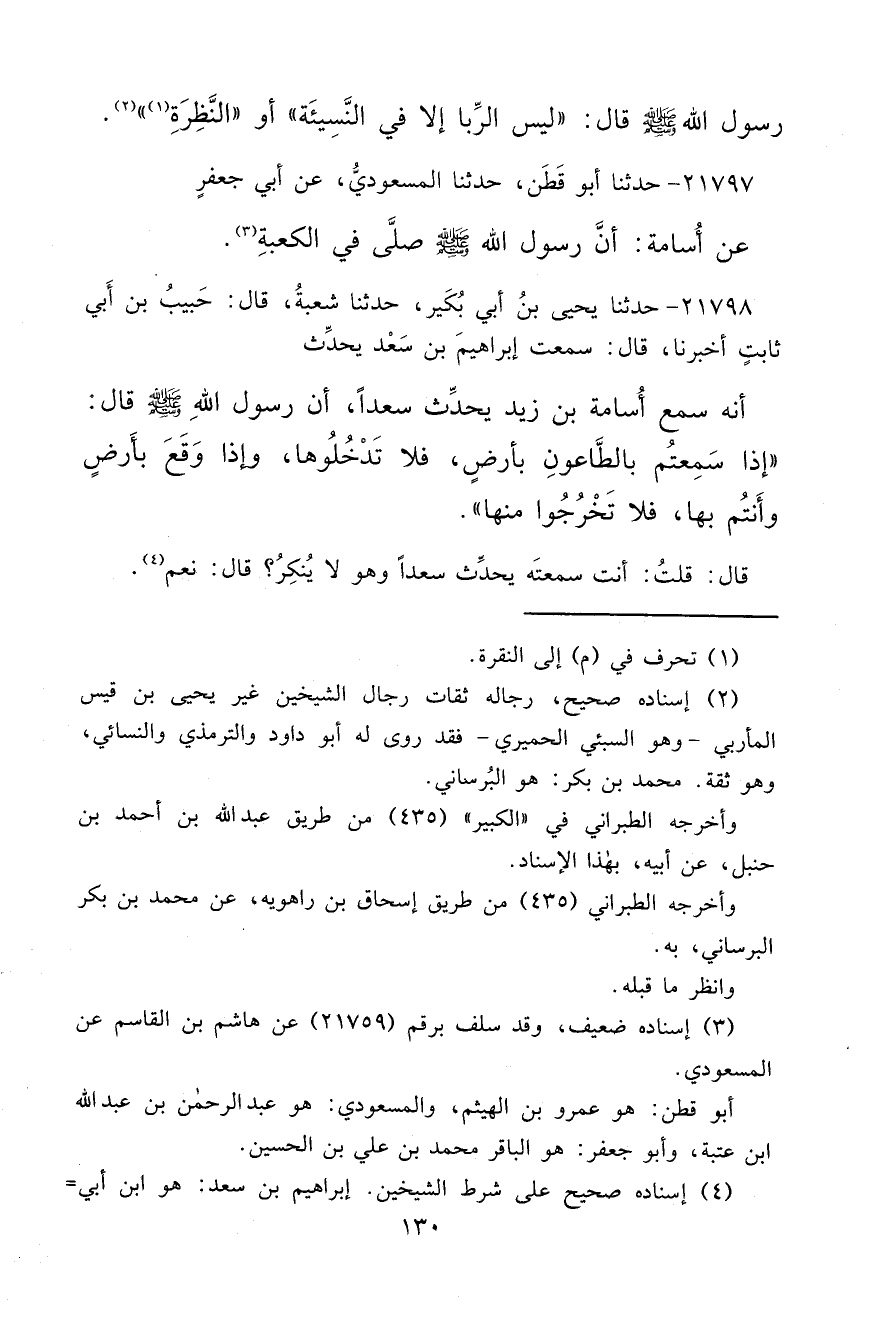 ٢١٧٩٨ - حَدَّثَنَا يَحْيَى بْنُ أَبِي بُكَيْرٍ، حَدَّثَنَا شُعْبَةُ، قَالَ: حَبِيبُ بْنُ أَبِي ثَابِتٍ، أَخْبَرَنَا قَالَ: سَمِعْتُ إِبْرَاهِيمَ بْنَ سَعْدٍ، يُحَدِّثُ أَنَّهُ سَمِعَ أُسَامَةَ بْنَ زَيْدٍ، يُحَدِّثُ سَعْدًا، أَنَّ رَسُولَ اللهِ صَلَّى اللهُ عَلَيْهِ وَسَلَّمَ قَالَ: " إِذَا سَمِعْتُمْ بِالطَّاعُونِ بِأَرْضٍ، فَلَا تَدْخُلُوهَا، وَإِذَا وَقَعَ بِأَرْضٍ وَأَنْتُمْ بِهَا، فَلَا تَخْرُجُوا مِنْهَا " قَالَ: قُلْتُ: أَنْتَ سَمِعْتَهُ يُحَدِّثُ سَعْدًا، وَهُوَ لَا يُنْكِرُ؟ قَالَ: نَعَمْ (٤)