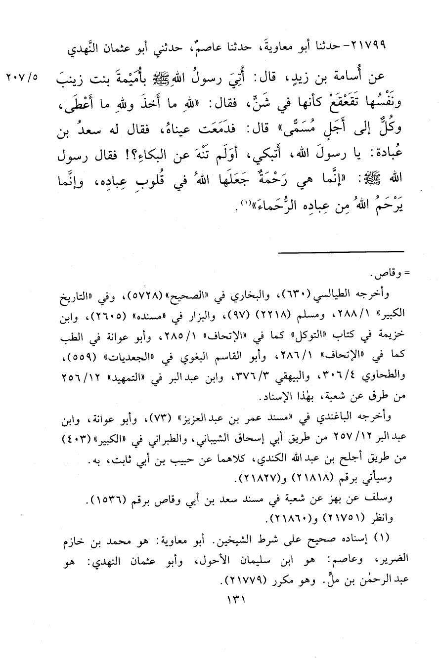 ٢١٧٩٩ - حَدَّثَنَا أَبُو مُعَاوِيَةَ، حَدَّثَنَا عَاصِمٌ، حَدَّثَنِي أَبُو عُثْمَانَ النَّهْدِيُّ، عَنْ أُسَامَةَ بْنِ زَيْدٍ، قَالَ: أُتِيَ رَسُولُ اللهِ صَلَّى اللهُ عَلَيْهِ وَسَلَّمَ بِأُمَيْمَةَ بِنْتِ زَيْنَبَ وَنَفْسُهَا تَقَعْقَعُ كَأَنَّهَا فِي شَنٍّ، فَقَالَ: " لِلَّهِ مَا أَخَذَ، وَلِلَّهِ مَا أَعْطَى، وَكُلٌّ إِلَى أَجَلٍ مُسَمًّى " قَالَ: فَدَمَعَتْ عَيْنَاهُ، فَقَالَ لَهُ سَعْدُ بْنُ عُبَادَةَ: يَا رَسُولَ اللهِ، أَتَبْكِي، أَوَلَمْ تَنْهَ عَنِ الْبُكَاءِ؟ فَقَالَ رَسُولُ اللهِ صَلَّى اللهُ عَلَيْهِ وَسَلَّمَ: " إِنَّمَا هِيَ رَحْمَةٌ جَعَلَهَا اللهُ فِي قُلُوبِ عِبَادِهِ، وَإِنَّمَا يَرْحَمُ اللهُ مِنْ عِبَادِهِ الرُّحَمَاءَ " (١)