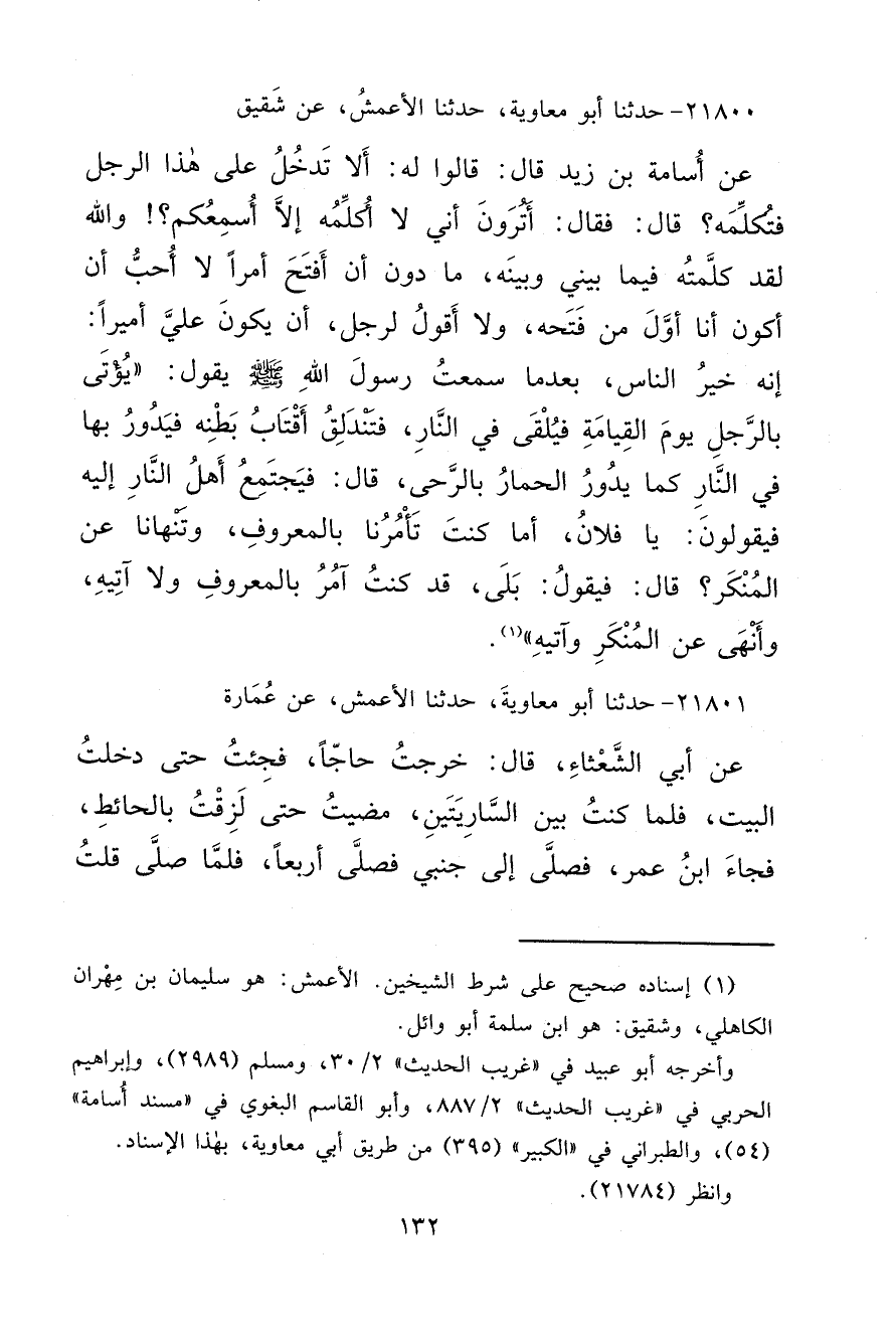 ٢١٨٠٠ - حَدَّثَنَا أَبُو مُعَاوِيَةَ، حَدَّثَنَا الْأَعْمَشُ، عَنْ شَقِيقٍ، عَنْ أُسَامَةَ بْنِ زَيْدٍ، قَالَ: قَالُوا لَهُ: أَلَا تَدْخُلُ عَلَى هَذَا الرَّجُلِ فَتُكَلِّمُهُ؟ قَالَ: فَقَالَ: أَلَا تَرَوْنَ أَنِّي لَا أُكَلِّمُهُ إِلَّا أُسْمِعُكُمْ؟ وَاللهِ لَقَدْ كَلَّمْتُهُ فِيمَا بَيْنِي وَبَيْنَهُ، مَا دُونَ أَنْ أَفْتَحَ أَمْرًا لَا أُحِبُّ أَنْ أَكُونَ أَنَا أَوَّلَ مَنْ فَتَحَهُ، وَلَا أَقُولُ لِرَجُلٍ، أَنْ يَكُونَ عَلَيَّ أَمِيرًا: إِنَّهُ خَيْرُ النَّاسِ، بَعْدَ مَا سَمِعْتُ رَسُولَ اللهِ صَلَّى اللهُ عَلَيْهِ وَسَلَّمَ يَقُولُ: " يُؤْتَى بِالرَّجُلِ يَوْمَ الْقِيَامَةِ فَيُلْقَى فِي النَّارِ، فَتَنْدَلِقُ أَقْتَابُ بَطْنِهِ فَيَدُورُ بِهَا فِي النَّارِ كَمَا يَدُورُ الْحِمَارُ بِالرَّحَى "، قَالَ: " فَيَجْتَمِعُ أَهْلُ النَّارِ إِلَيْهِ فَيَقُولُونَ: يَا فُلَانُ، أَمَا كُنْتَ تَأْمُرُنَا بِالْمَعْرُوفِ، وَتَنْهَانَا عَنِ الْمُنْكَرِ؟ " قَالَ: " فَيَقُولُ: بَلَى، قَدْ كُنْتُ آمُرُ بِالْمَعْرُوفِ وَلَا آتِيهِ، وَأَنْهَى عَنِ الْمُنْكَرِ وَآتِيهِ " (١)