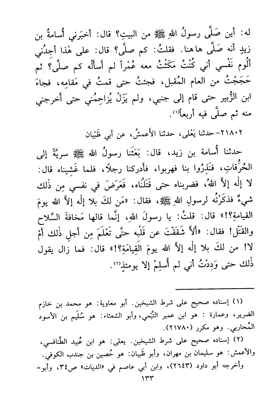 ٢١٨٠٢ - حَدَّثَنَا يَعْلَى، حَدَّثَنَا الْأَعْمَشُ، عَنْ أَبِي ظَبْيَانَ، حَدَّثَنَا أُسَامَةُ بْنُ زَيْدٍ، قَالَ: بَعَثَنَا رَسُولُ اللهِ صَلَّى اللهُ عَلَيْهِ وَسَلَّمَ سَرِيَّةً إِلَى الْحُرَقَاتِ، فَنَذِرُوا بِنَا فَهَرَبُوا، فَأَدْرَكْنَا رَجُلًا، فَلَمَّا غَشِينَاهُ قَالَ: لَا إِلَهَ إِلَّا اللهُ، فَضَرَبْنَاهُ حَتَّى قَتَلْنَاهُ، فَعَرَضَ فِي نَفْسِي مِنْ ذَلِكَ شَيْءٌ فَذَكَرْتُهُ لِرَسُولِ اللهِ صَلَّى اللهُ عَلَيْهِ وَسَلَّمَ فَقَالَ: " مَنْ لَكَ بِلَا إِلَهَ إِلَّا اللهُ يَوْمَ الْقِيَامَةِ؟ " قَالَ: قُلْتُ: يَا رَسُولَ اللهِ، إِنَّمَا قَالَهَا مَخَافَةَ السِّلَاحِ وَالْقَتْلِ فَقَالَ: " أَلَا شَقَقْتَ عَنْ قَلْبِهِ حَتَّى تَعْلَمَ مِنْ أَجْلِ ذَلِكَ أَمْ لَا مَنْ لَكَ بِلَا إِلَهَ إِلَّا اللهُ يَوْمَ الْقِيَامَةِ؟ " قَالَ: فَمَا زَالَ يَقُولُ: ذَلِكَ حَتَّى وَدِدْتُ أَنِّي لَمْ أُسْلِمْ إِلَّا يَوْمَئِذٍ (٢)