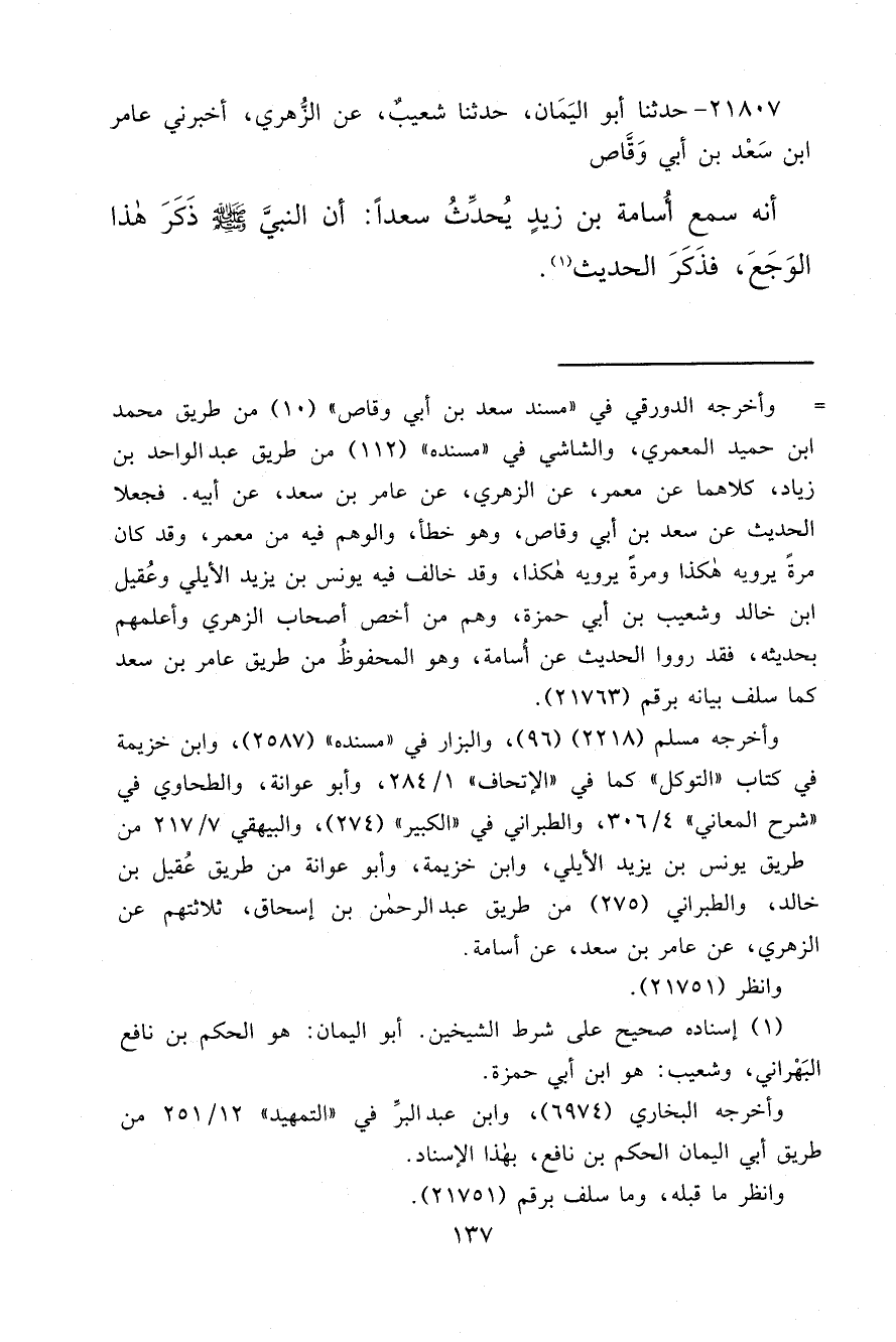 ٢١٨٠٧ - حَدَّثَنَا أَبُو الْيَمَانِ، حَدَّثَنَا شُعَيْبٌ، عَنِ الزُّهْرِيِّ، أَخْبَرَنِي عَامِرُ بْنُ سَعْدِ بْنِ أَبِي وَقَّاصٍ، أَنَّهُ سَمِعَ أُسَامَةَ بْنَ زَيْدٍ، يُحَدِّثُ سَعْدًا: أَنَّ النَّبِيَّ صَلَّى اللهُ عَلَيْهِ وَسَلَّمَ ذَكَرَ هَذَا الْوَجَعَ، فَذَكَرَ الْحَدِيثَ (١)