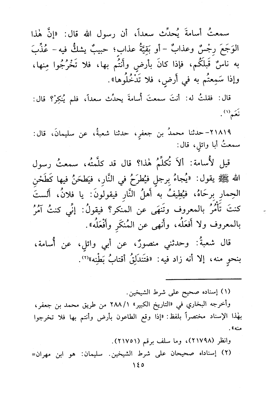 ٢١٨١٩ - حَدَّثَنَا مُحَمَّدُ بْنُ جَعْفَرٍ، حَدَّثَنَا شُعْبَةُ، عَنْ سُلَيْمَانَ، قَالَ: سَمِعْتُ أَبَا وَائِلٍ، قَالَ: قِيلَ لِأُسَامَةَ: أَلَا تُكَلِّمُ هَذَا؟ قَالَ قَدْ كَلَّمْتُهُ، سَمِعْتُ رَسُولَ اللهِ صَلَّى اللهُ عَلَيْهِ وَسَلَّمَ يَقُولُ: " يُجَاءُ بِرَجُلٍ فَيُطْرَحُ فِي النَّارِ، فَيَطْحَنُ فِيهَا كَطَحْنِ الْحِمَارِ بِرَحَاهُ، فَيُطِيفُ بِهِ أَهْلُ النَّارِ فَيَقُولُونَ: يَا فُلَانُ، أَلَسْتَ كُنْتَ تَأْمُرُ بِالْمَعْرُوفِ وَتَنْهَى عَنِ الْمُنْكَرِ؟ فَيَقُولُ: إِنِّي كُنْتُ آمُرُ بِالْمَعْرُوفِ وَلَا أَفْعَلُهُ، وَأَنْهَى عَنِ الْمُنْكَرِ وَأَفْعَلُهُ " قَالَ شُعْبَةُ: وَحَدَّثَنِي مَنْصُورٌ، عَنْ أَبِي وَائِلٍ، عَنْ أُسَامَةَ، بِنَحْوٍ مِنْهُ، إِلَّا أَنَّهُ زَادَ فِيهِ: " فَتَنْدَلِقُ أَقْتَابُ بَطْنِهِ " (٢)
