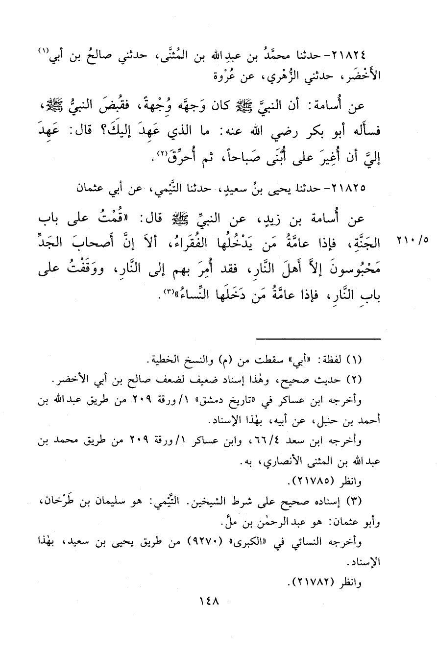 ٢١٨٢٥ - حَدَّثَنَا يَحْيَى بْنُ سَعِيدٍ، حَدَّثَنَا التَّيْمِيُّ، عَنْ أَبِي عُثْمَانَ، عَنْ أُسَامَةَ بْنِ زَيْدٍ، عَنِ النَّبِيِّ صَلَّى اللهُ عَلَيْهِ وَسَلَّمَ قَالَ: " قُمْتُ عَلَى بَابِ الْجَنَّةِ، فَإِذَا عَامَّةُ مَنْ يَدْخُلُهَا الْفُقَرَاءُ، إِلَّا أَنَّ أَصْحَابَ الْجَدِّ مَحْبُوسُونَ إِلَّا أَهْلَ النَّارِ، فَقَدْ أُمِرَ بِهِمْ إِلَى النَّارِ، وَوَقَفْتُ عَلَى بَابِ النَّارِ، فَإِذَا عَامَّةُ مَنْ دَخَلَهَا النِّسَاءُ " (٣)