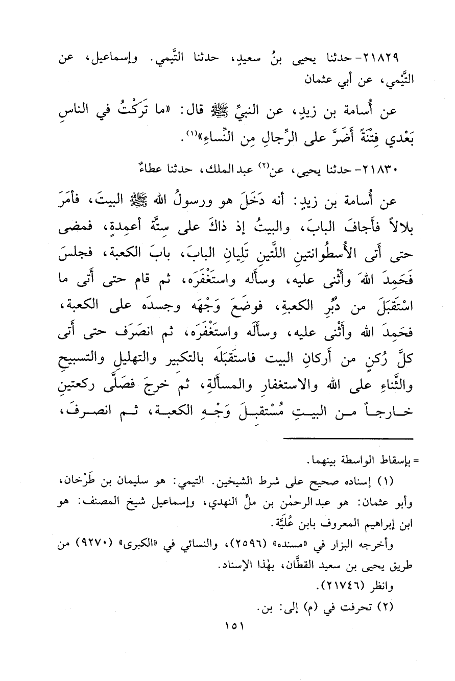 ٢١٨٢٩ - حَدَّثَنَا يَحْيَى بْنُ سَعِيدٍ، حَدَّثَنَا التَّيْمِيُّ، وَإِسْمَاعِيلُ، عَنِ التَّيْمِيِّ، عَنْ أَبِي عُثْمَانَ، عَنْ أُسَامَةَ بْنِ زَيْدٍ، عَنِ النَّبِيِّ صَلَّى اللهُ عَلَيْهِ وَسَلَّمَ قَالَ: " مَا تَرَكْتُ فِي النَّاسِ بَعْدِي فِتْنَةً أَضَرَّ عَلَى الرِّجَالِ مِنَ النِّسَاءِ " (١)