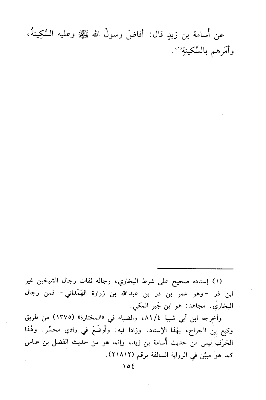 عَنْ أُسَامَةَ بْنِ زَيْدٍ، قَالَ: " أَفَاضَ رَسُولُ اللهِ صَلَّى اللهُ عَلَيْهِ وَسَلَّمَ وَعَلَيْهِ السَّكِينَةُ، وَأَمَرَهُمْ بِالسَّكِينَةِ " (١)