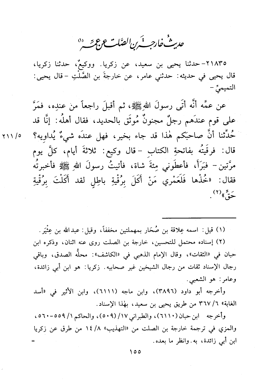 ٢١٨٣٥ - حَدَّثَنَا يَحْيَى بْنُ سَعِيدٍ، عَنْ زَكَرِيَّا، وَوَكِيعٌ، حَدَّثَنَا زَكَرِيَّا، قَالَ يَحْيَى فِي حَدِيثِهِ: حَدَّثَنِي عَامِرٌ، عَنْ خَارِجَةَ بْنِ الصَّلْتِ، قَالَ يَحْيَى التَّمِيمِيُّ: عَنْ عَمِّهِ، أَنَّهُ أَتَى رَسُولَ اللهِ صَلَّى اللهُ عَلَيْهِ وَسَلَّمَ، ثُمَّ أَقْبَلَ رَاجِعًا مِنْ عِنْدِهِ، فَمَرَّ عَلَى قَوْمٍ عِنْدَهُمْ رَجُلٌ مَجْنُونٌ مُوثَقٌ بِالْحَدِيدِ، فَقَالَ أَهْلُهُ: إِنَّا قَدْ حُدِّثْنَا أَنَّ صَاحِبَكُمْ هَذَا قَدْ جَاءَ بِخَيْرٍ، فَهَلْ عِنْدَهُ شَيْءٌ يُدَاوِيهِ؟ قَالَ: فَرَقَيْتُهُ بِفَاتِحَةِ الْكِتَابِ، قَالَ وَكِيعٌ: ثَلَاثَةَ أَيَّامٍ، كُلَّ يَوْمٍ مَرَّتَيْنِ، فَبَرَأَ، فَأَعْطَوْنِي مِائَةَ شَاةٍ، فَأَتَيْتُ رَسُولَ اللهِ صَلَّى اللهُ عَلَيْهِ وَسَلَّمَ فَأَخْبَرْتُهُ فَقَالَ: " خُذْهَا فَلَعَمْرِي مَنْ أَكَلَ بِرُقْيَةِ بَاطِلٍ لَقَدْ أَكَلْتَ بِرُقْيَةِ حَقٍّ " (٢)