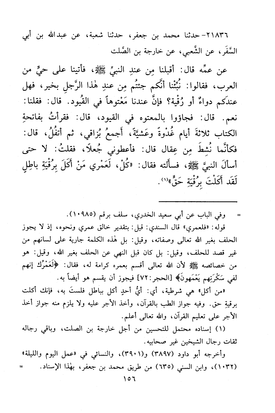 ٢١٨٣٦ - حَدَّثَنَا مُحَمَّدُ بْنُ جَعْفَرٍ، حَدَّثَنَا شُعْبَةُ، عَنْ عَبْدِ اللهِ بْنِ أَبِي السَّفَرِ، عَنِ الشَّعْبِيِّ، عَنْ خَارِجَةَ بْنِ الصَّلْتِ، عَنْ عَمِّهِ، قَالَ: أَقْبَلْنَا مِنْ عِنْدِ النَّبِيِّ صَلَّى اللهُ عَلَيْهِ وَسَلَّمَ، فَأَتَيْنَا عَلَى حَيٍّ مِنَ الْعَرَبِ، فَقَالُوا: نُبِّئْنَا أَنَّكُمْ جِئْتُمْ مِنْ عِنْدِ هَذَا الرَّجُلِ بِخَيْرٍ، فَهَلْ عِنْدَكُمْ دَوَاءٌ أَوْ رُقْيَةٌ؟ فَإِنَّ عِنْدَنَا مَعْتُوهًا فِي الْقُيُودِ. قَالَ: فَقُلْنَا: نَعَمْ. قَالَ: فَجَاءُوا بِالْمَعْتُوهِ فِي الْقُيُودِ، قَالَ: فَقَرَأْتُ بِفَاتِحَةِ الْكِتَابِ ثَلَاثَةَ أَيَّامٍ غُدْوَةً وَعَشِيَّةً، أَجْمَعُ بُزَاقِي، ثُمَّ أَتْفُلُ، قَالَ: فَكَأَنَّمَا نَشِطَ مِنْ عِقَالٍ قَالَ: فَأَعْطَوْنِي جُعْلًا، فَقُلْتُ: لَا حَتَّى أَسْأَلَ النَّبِيَّ صَلَّى اللهُ عَلَيْهِ وَسَلَّمَ، فَسَأَلْتُهُ فَقَالَ: " كُلْ لَعَمْرِي مَنْ أَكَلَ بِرُقْيَةِ بَاطِلٍ لَقَدْ أَكَلْتَ بِرُقْيَةِ حَقٍّ " (١)
