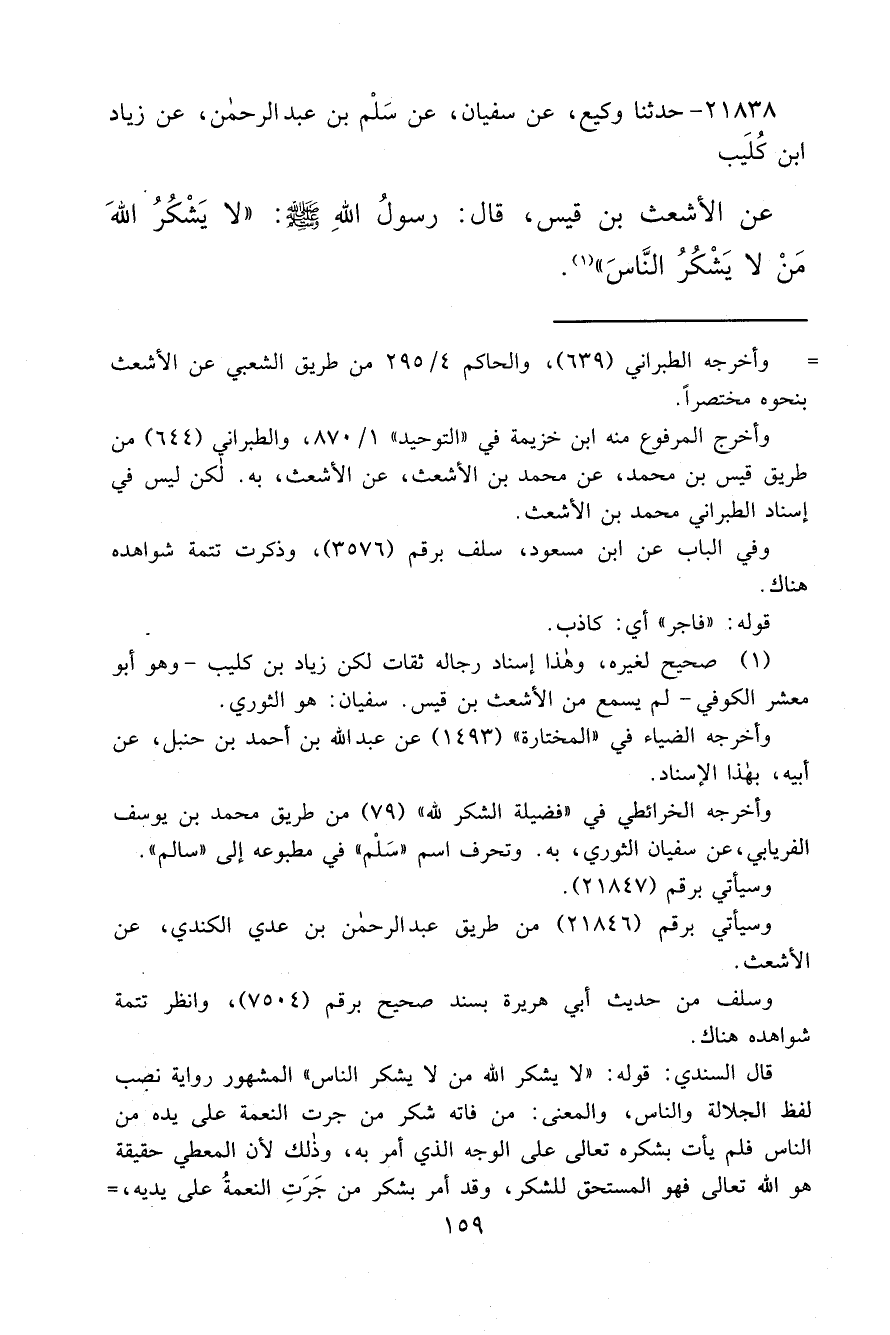 ٢١٨٣٨ - حَدَّثَنَا وَكِيعٌ، عَنْ سُفْيَانَ، عَنْ سَلْمِ بْنِ عَبْدِ الرَّحْمَنِ، عَنْ زِيَادِ بْنِ كُلَيْبٍ، عَنِ الْأَشْعَثِ بْنِ قَيْسٍ، قَالَ: قَالَ رَسُولُ اللهِ صَلَّى اللهُ عَلَيْهِ وَسَلَّمَ: " لَا يَشْكُرُ اللهَ مَنْ لَا يَشْكُرُ النَّاسَ " (١)