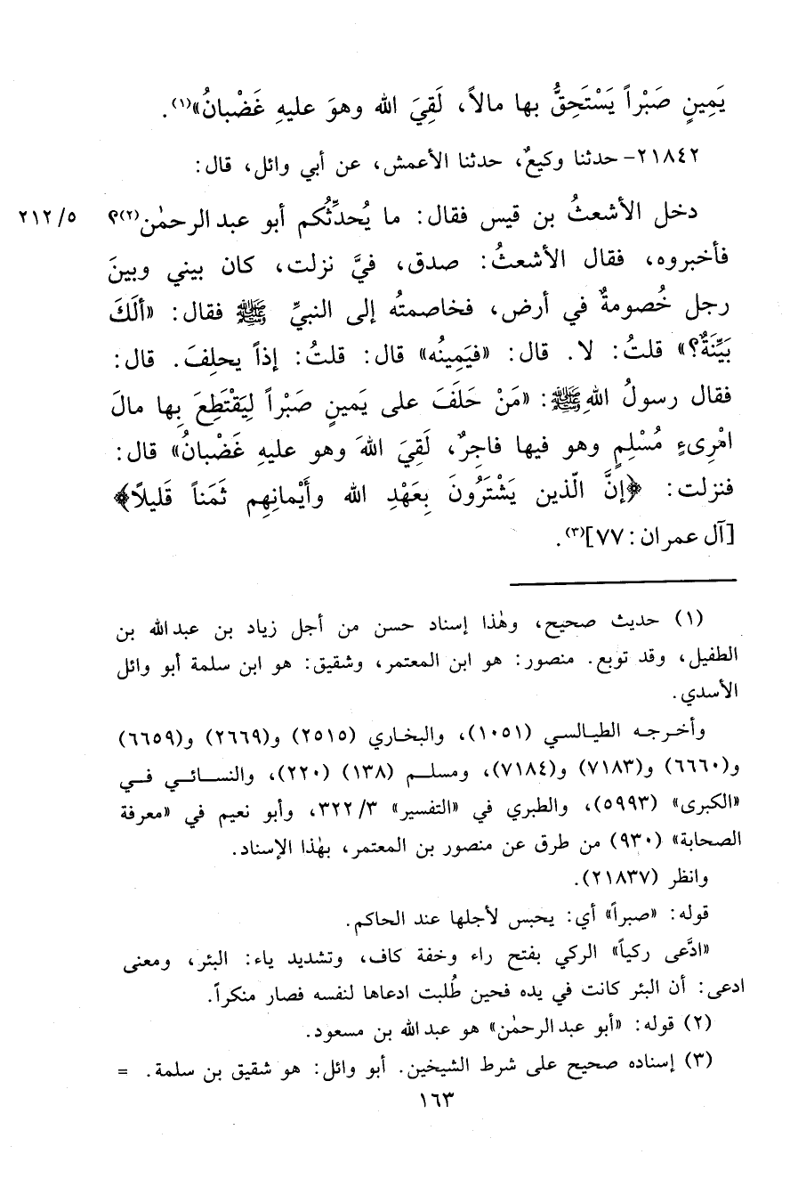 ٢١٨٤٢ - حَدَّثَنَا وَكِيعٌ، حَدَّثَنَا الْأَعْمَشُ، عَنْ أَبِي وَائِلٍ، قَالَ: دَخَلَ الْأَشْعَثُ بْنُ قَيْسٍ، فَقَالَ: مَا يُحَدِّثُكُمْ أَبُو عَبْدِ الرَّحْمَنِ (٢) ؟ فَأَخْبَرُوهُ، فَقَالَ الْأَشْعَثُ: صَدَقَ، فِيَّ نَزَلَتْ، كَانَ بَيْنِي وَبَيْنَ رَجُلٍ خُصُومَةٌ فِي أَرْضٍ، فَخَاصَمْتُهُ إِلَى النَّبِيِّ صَلَّى اللهُ عَلَيْهِ وَسَلَّمَ فَقَالَ: " أَلَكَ بَيِّنَةٌ؟ " قُلْتُ: لَا. قَالَ: " فَيَمِينُهُ " قَالَ: قُلْتُ: إِذَنْ يَحْلِفَ. قَالَ: فَقَالَ رَسُولُ اللهِ صَلَّى اللهُ عَلَيْهِ وَسَلَّمَ: " مَنْ حَلَفَ عَلَى يَمِينٍ صَبْرًا لِيَقْتَطِعَ بِهَا مَالَ امْرِئٍ مُسْلِمٍ وَهُوَ فِيهَا فَاجِرٌ، لَقِيَ اللهَ وَهُوَ عَلَيْهِ غَضْبَانُ " قَالَ: فَنَزَلَتْ: {إِنَّ الَّذِينَ يَشْتَرُونَ بِعَهْدِ اللهِ وَأَيْمَانِهِمْ ثَمَنًا قَلِيلًا} [آل عمران: ٧٧] (٣)