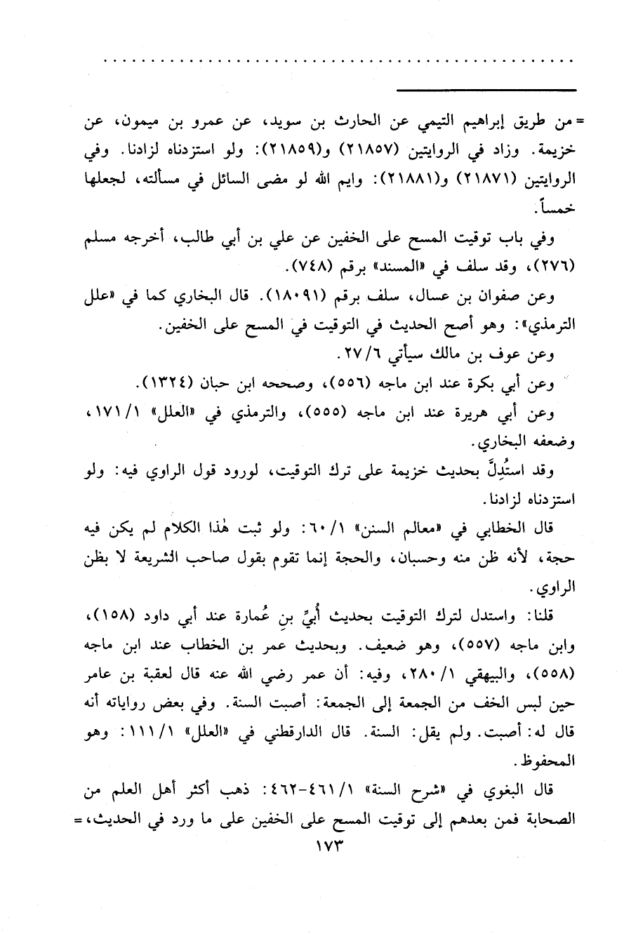 قلنا: واستدل لترك التوقيت بحديث أُبيِّ بنِ عُمارة عند أبي داود (١٥٨) ، وابن ماجه (٥٥٧) ، وهو ضعيف. وبحديث عمر بن الخطاب عند ابن ماجه (٥٥٨) ، والبيهقي ١/٢٨٠، وفيه: أن عمر رضي الله عنه قال لعقبة بن عامر حين لبس الخف من الجمعة إلى الجمعة: أصبت السنة. وفي بعض رواياته أنه قال له: أصبت. ولم يقل: السنة. قال الدارقطني في "العلل" ١/١١١: وهو المحفوظ.