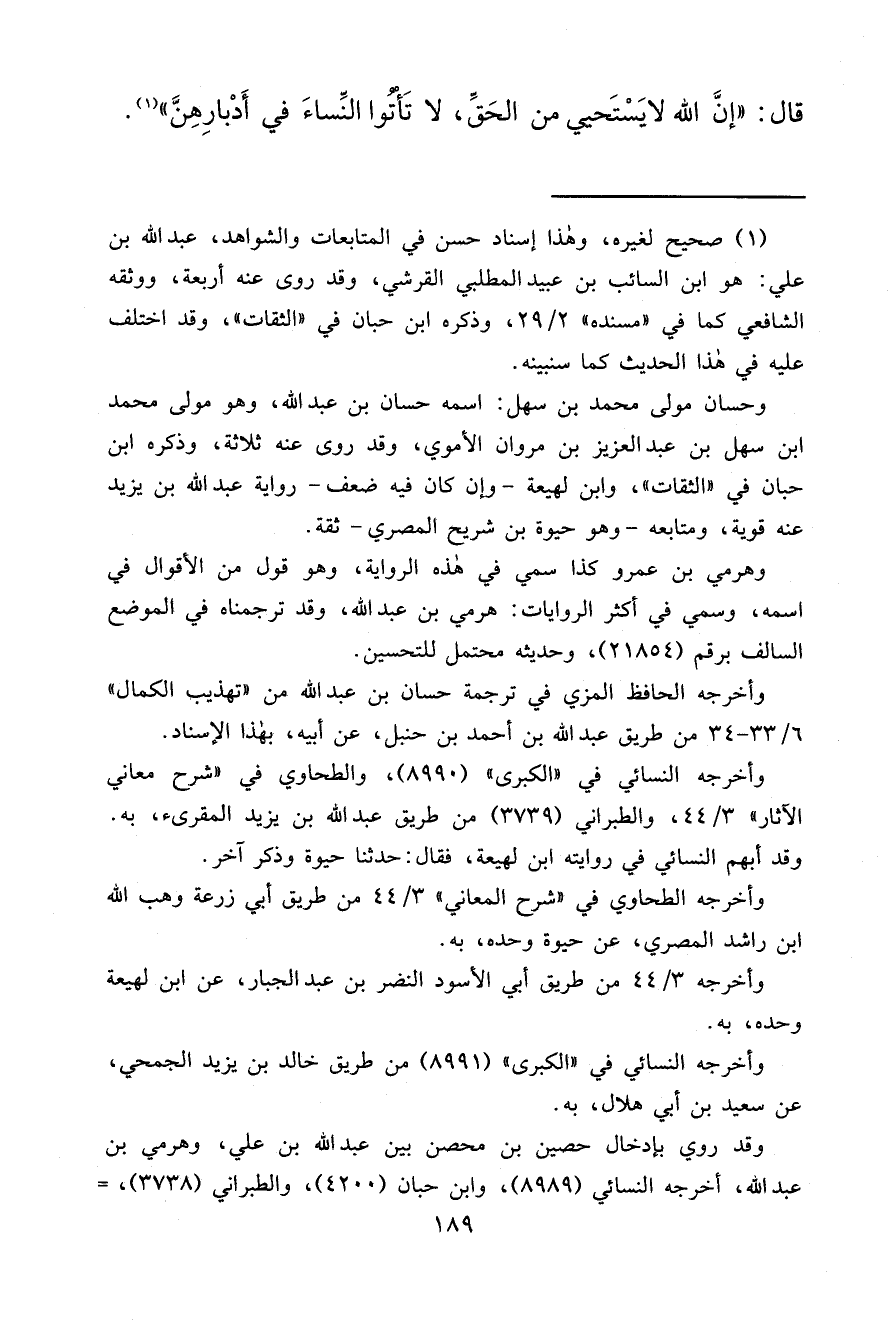 قَالَ: " إِنَّ اللهَ لَا يَسْتَحْيِي مِنَ الْحَقِّ، لَا تَأْتُوا النِّسَاءَ فِي أَدْبَارِهِنَّ " (١)