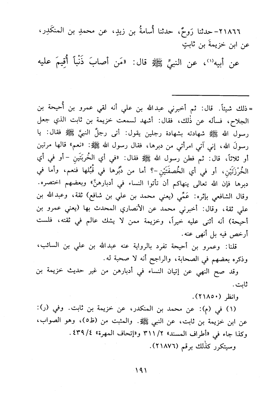 = ذلك شيئاً. قال: ثم أخبرني عبد الله بن علي أنه لقي عمرو بن أُحيحة بن الجلاح، فسأله عن ذلك، فقال: أشهد لسمعت خزيمة بن ثابت الذي جعل رسول الله صَلَّى اللهُ عَلَيْهِ وَسَلَّمَ شهادته بشهادة رجلين يقول: أتى رجلٌ النبيَّ صَلَّى اللهُ عَلَيْهِ وَسَلَّمَ فقال: يا رسولَ الله، إني آتي امرأتي من دبرها، فقال رسول الله صَلَّى اللَّه عَلَيْهِ وَسَلَّمَ: "نعم" قالها مرتين أو ثلاثاً، قال: ثم فطن رسول الله صَلَّى اللَّه عَلَيْهِ وَسَلَّمَ فقال: "في أي الخُربَتَينِ -أو في أي الخُرْزَتَيْنِ، أو في أي الخُصفَتَيْنِ-؟ أما من دُبُرها في قُبُلها فنعم، وأما في دبرها فإن الله تعالى ينهاكم أن تأتوا النساء في أدبارهنَّ" وبعضهم اختصره.