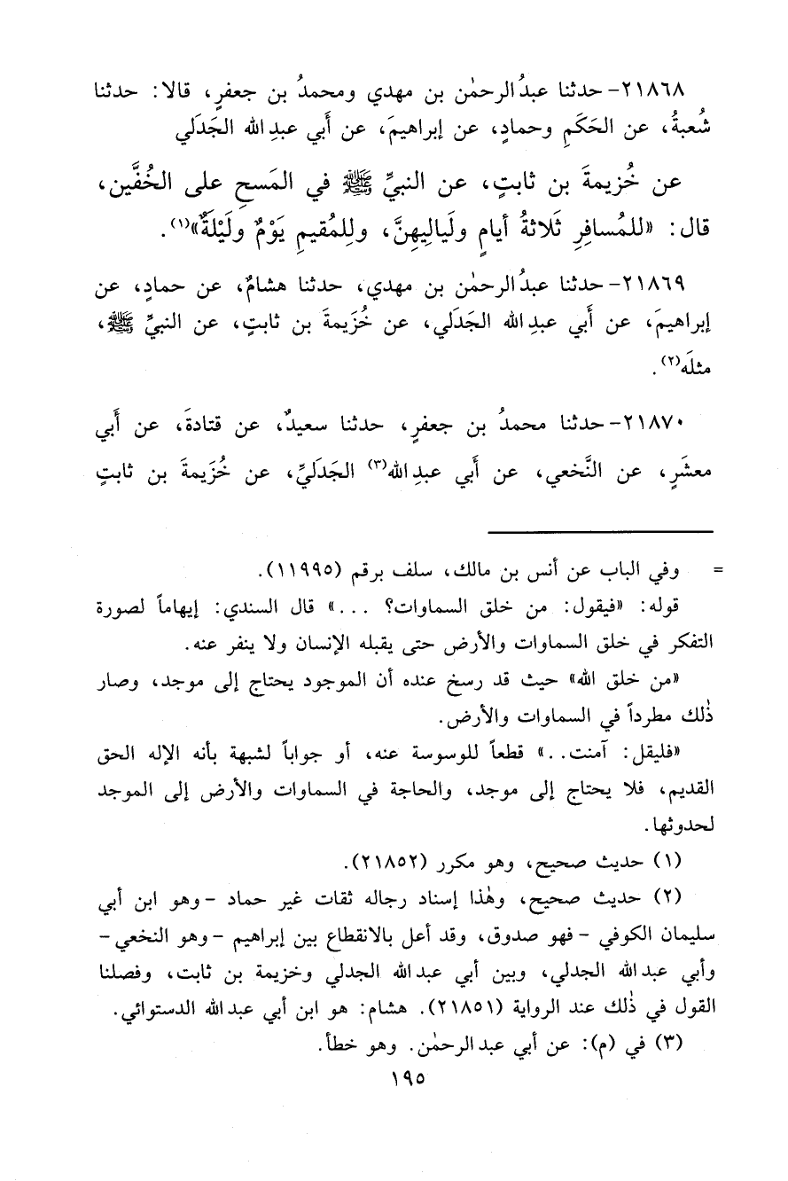 (٢) حديث صحيح، وهذا إسناد رجاله ثقات غير حماد -وهو ابن أبي سليمان الكوفي- فهو صدوق، وقد أعل بالانقطاع بين إبراهيم -وهو النخعي- وأبي عبد الله الجدلي، وبين أبي عبد الله الجدلي وخزيمة بن ثابت، وفصلنا القول في ذلك عند الرواية (٢١٨٥١) . هشام: هو ابن أبي عبد الله الدستوائي.