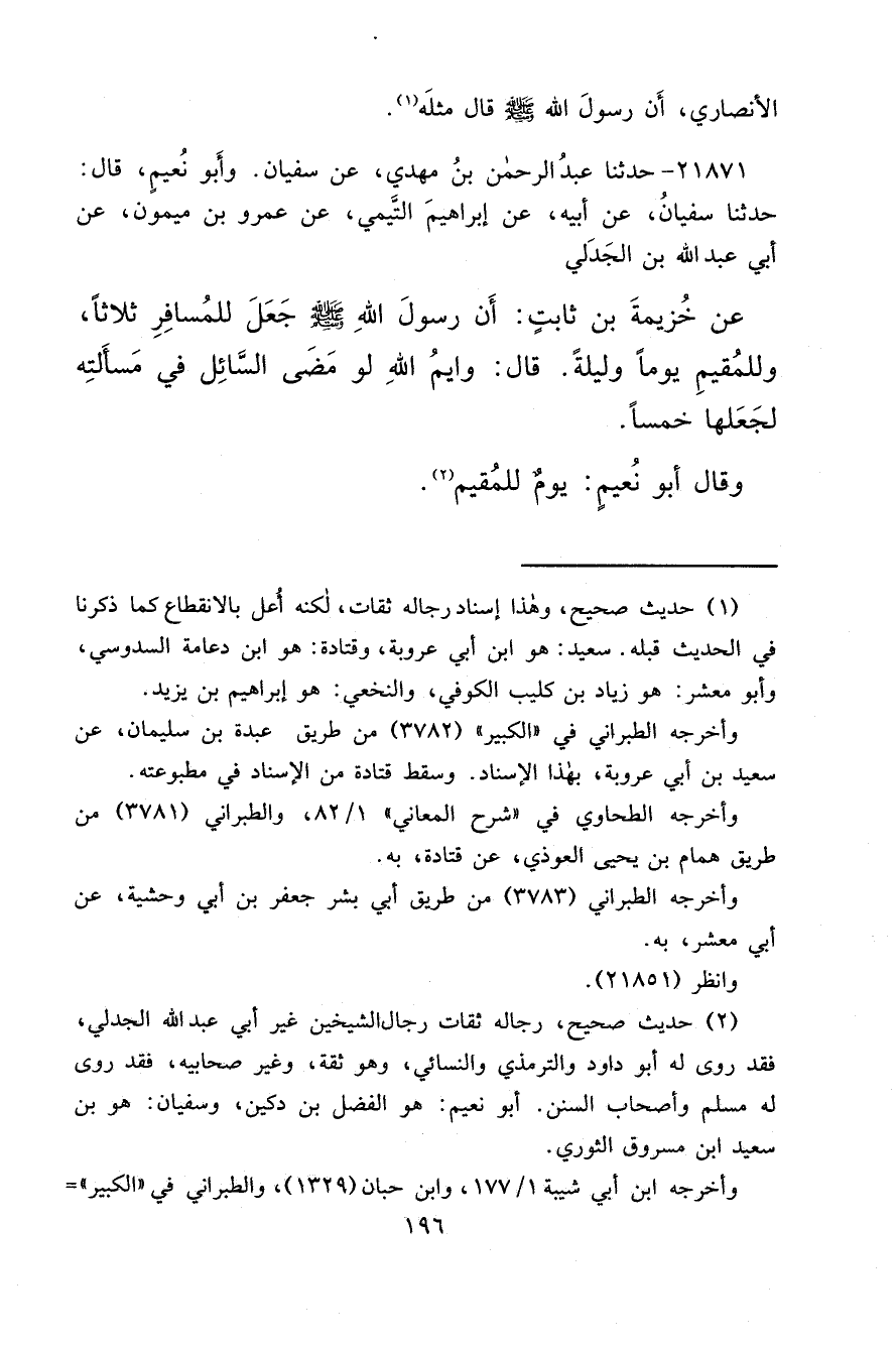 ٢١٨٧١ - حَدَّثَنَا عَبْدُ الرَّحْمَنِ بْنُ مَهْدِيٍّ، عَنْ سُفْيَانَ، وَأَبُو نُعَيْمٍ، قَالَ: حَدَّثَنَا سُفْيَانُ، عَنْ أَبِيهِ، عَنْ إِبْرَاهِيمَ التَّيْمِيِّ، عَنْ عَمْرِو بْنِ مَيْمُونٍ، عَنْ أَبِي عَبْدِ اللهِ الْجَدَلِيِّ، عَنْ خُزَيْمَةَ بْنِ ثَابِتٍ: " أَنَّ رَسُولَ اللهِ صَلَّى اللهُ عَلَيْهِ وَسَلَّمَ جَعَلَ لِلْمُسَافِرِ ثَلَاثًا، وَلِلْمُقِيمِ يَوْمًا وَلَيْلَةً " قَالَ: وَايْمُ اللهِ لَوْ مَضَى السَّائِلُ فِي مَسْأَلَتِهِ لَجَعَلَهَا خَمْسًا وَقَالَ أَبُو نُعَيْمٍ: يَوْمٌ لِلْمُقِيمِ (٢)