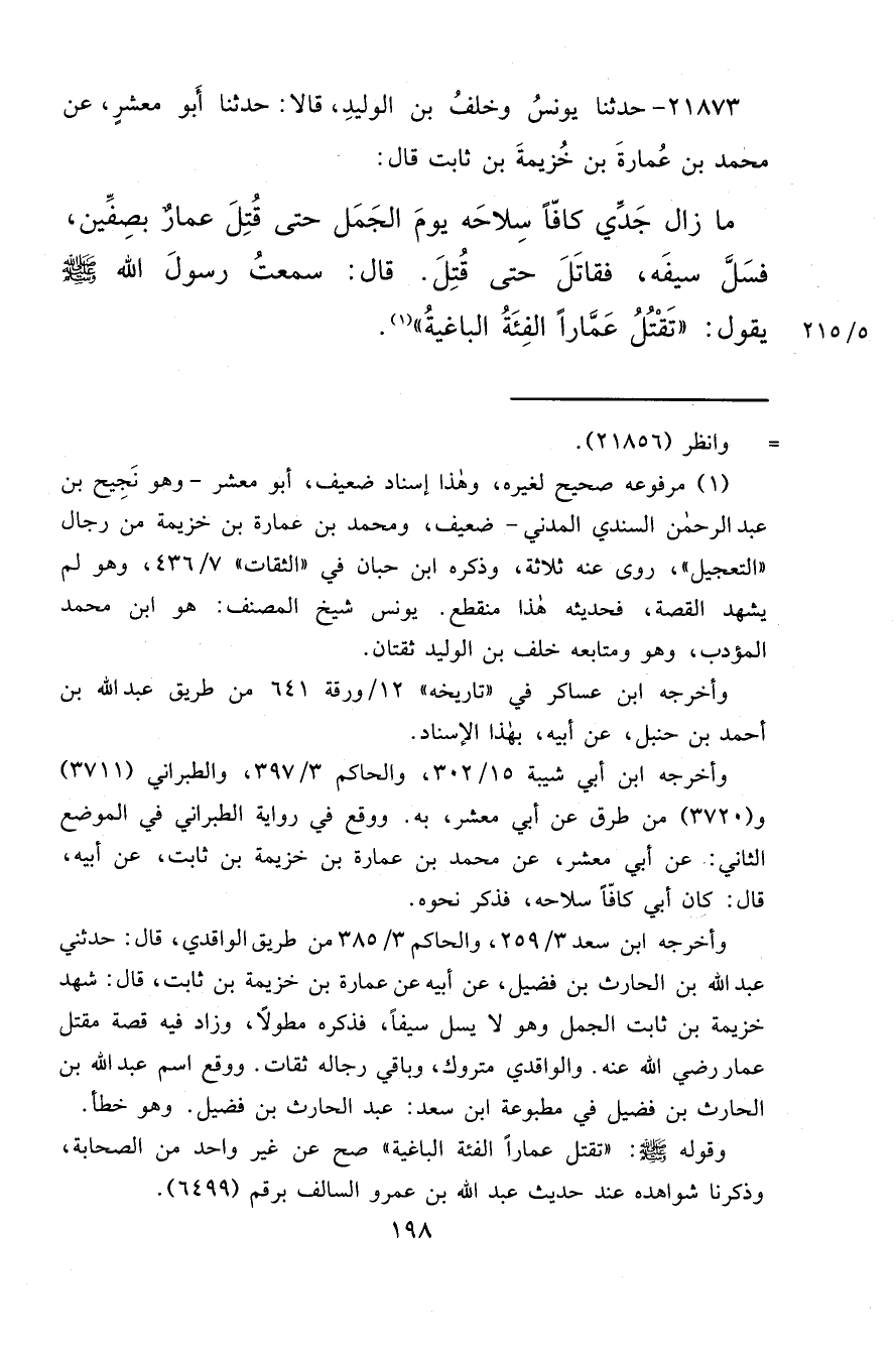 ٢١٨٧٣ - حَدَّثَنَا يُونُسُ، وَخَلَفُ بْنُ الْوَلِيدِ، قَالَا: حَدَّثَنَا أَبُو مَعْشَرٍ، عَنْ مُحَمَّدِ بْنِ عُمَارَةَ بْنِ خُزَيْمَةَ بْنِ ثَابِتٍ، قَالَ: مَا زَالَ جَدِّي، كَافًّا سِلَاحَهُ يَوْمَ الْجَمَلِ حَتَّى قُتِلَ عَمَّارٌ بِصِفِّينَ، فَسَلَّ سَيْفَهُ، فَقَاتَلَ حَتَّى قُتِلَ. قَالَ: سَمِعْتُ رَسُولَ اللهِ صَلَّى اللهُ عَلَيْهِ وَسَلَّمَ يَقُولُ: " تَقْتُلُ عَمَّارًا الْفِئَةُ الْبَاغِيَةُ " (١)