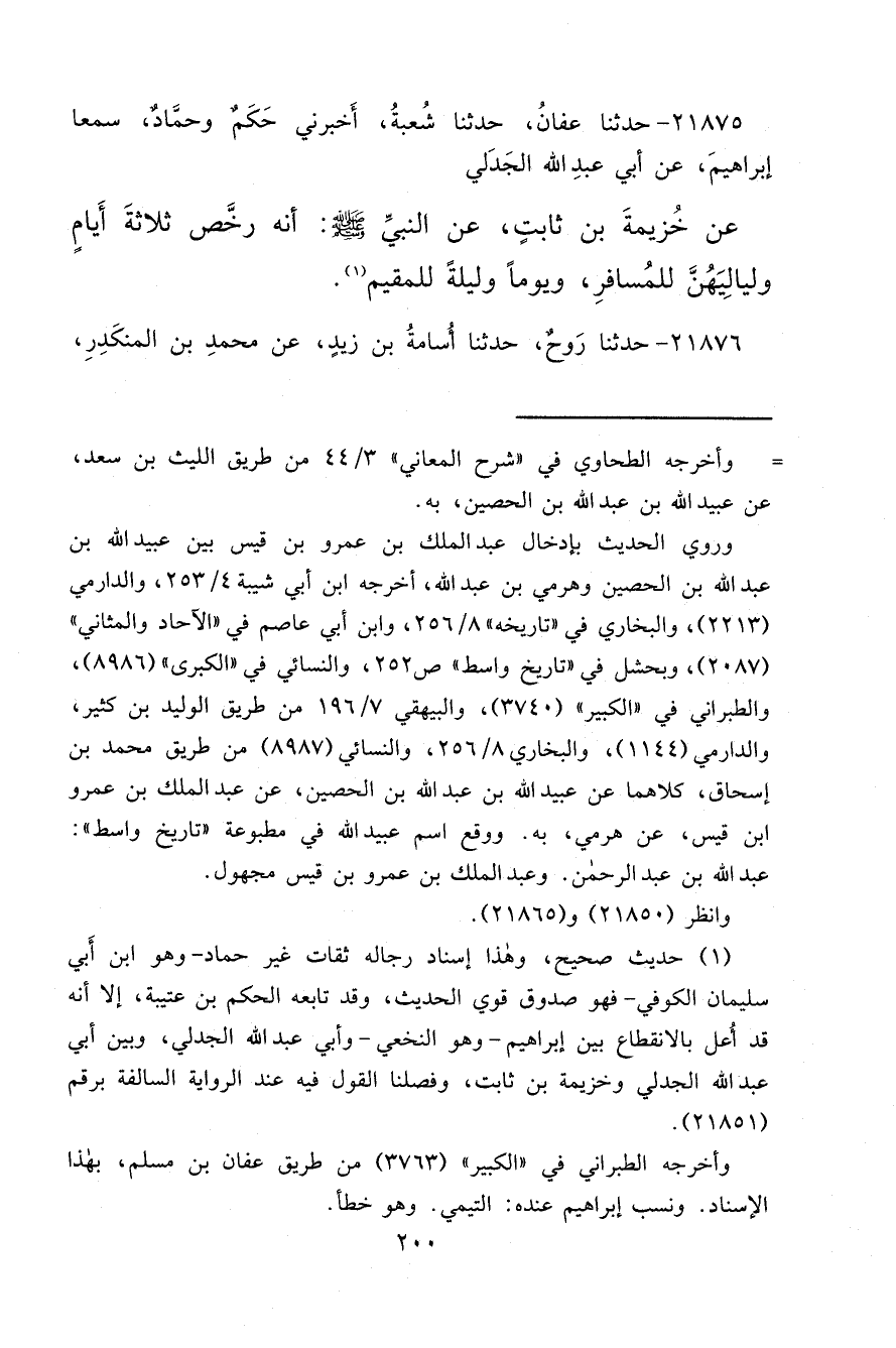 ٢١٨٧٥ - حَدَّثَنَا عَفَّانُ، حَدَّثَنَا شُعْبَةُ، أَخْبَرَنِي حَكَمٌ، وَحَمَّادٌ، سَمِعَا إِبْرَاهِيمَ، عَنْ أَبِي عَبْدِ اللهِ الْجَدَلِيِّ، عَنْ خُزَيْمَةَ بْنِ ثَابِتٍ، عَنِ النَّبِيِّ صَلَّى اللهُ عَلَيْهِ وَسَلَّمَ: " أَنَّهُ رَخَّصَ ثَلَاثَةَ أَيَّامٍ وَلَيَالِيَهُنَّ لِلْمُسَافِرِ، وَيَوْمًا وَلَيْلَةً لِلْمُقِيمِ " (١)