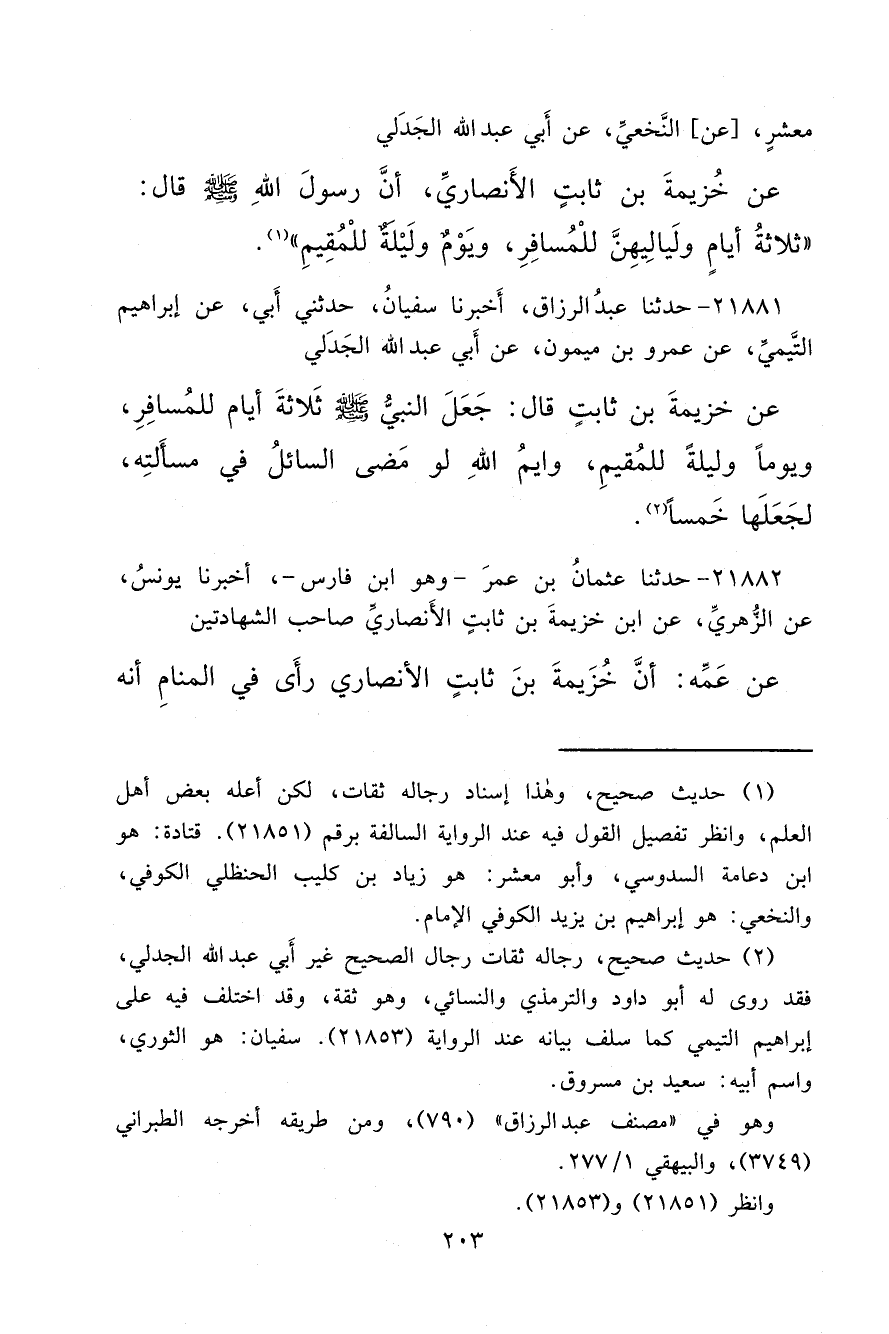 مَعْشَرٍ، عَنِ النَّخَعِيِّ، عَنْ أَبِي عَبْدِ اللهِ الْجَدَلِيِّ، عَنْ خُزَيْمَةَ بْنِ ثَابِتٍ الْأَنْصَارِيِّ، أَنَّ رَسُولَ اللهِ صَلَّى اللهُ عَلَيْهِ وَسَلَّمَ قَالَ: " ثَلَاثَةُ أَيَّامٍ وَلَيَالِيهِنَّ لِلْمُسَافِرِ، وَيَوْمٌ وَلَيْلَةٌ لِلْمُقِيمِ " (١)