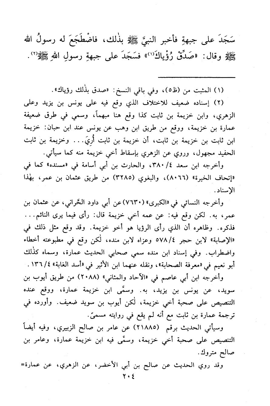 (٢) إسناده ضعيف للاختلاف الذي وقع فيه على يونس بن يزيد وعلى الزهري، وابن خزيمة بن ثابت كذا وقع هنا مبهماً، وسمي في طرق ضعيفة عمارة بن خزيمة، ووقع من طريق ابن وهب عن يونس عند ابن حبان: خزيمة ابن ثابت بن خزيمة بن ثابت، أن خزيمة بن ثابت أُرِيَ ... وخزيمة بن ثابت الحفيد مجهول، وروي عن الزهري بإسقاط أخي خزيمة منه كما سيأتي.