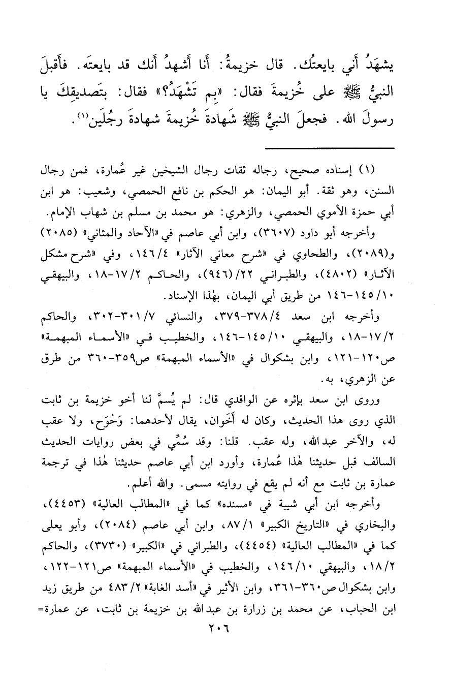 يَشْهَدُ أَنِّي بَايَعْتُكَ. قَالَ خُزَيْمَةُ: أَنَا أَشْهَدُ أَنَّكَ قَدْ بَايَعْتَهُ. فَأَقْبَلَ النَّبِيُّ صَلَّى اللهُ عَلَيْهِ وَسَلَّمَ عَلَى خُزَيْمَةَ فَقَالَ: " بِمَ تَشْهَدُ؟ " فَقَالَ: بِتَصْدِيقِكَ يَا رَسُولَ اللهِ. فَجَعَلَ النَّبِيُّ صَلَّى اللهُ عَلَيْهِ وَسَلَّمَ شَهَادَةَ خُزَيْمَةَ شَهَادَةَ رَجُلَيْنِ (١)