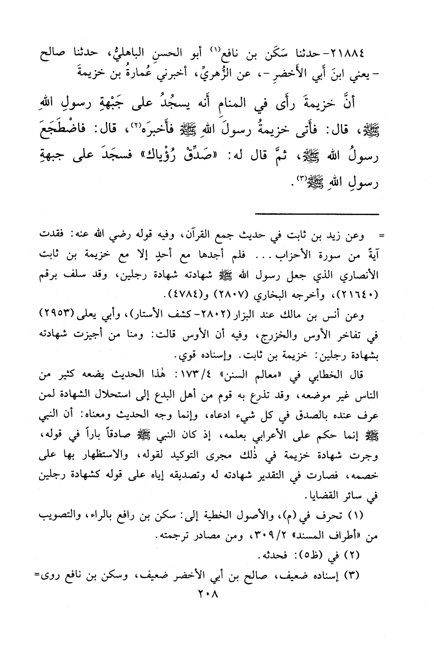 ٢١٨٨٤ - حَدَّثَنَا سَكَنُ بْنُ نَافِعٍ (١) أَبُو الْحَسَنِ الْبَاهِلِيُّ، حَدَّثَنَا صَالِحٌ يَعْنِي ابْنَ أَبِي الْأَخْضَرِ، عَنِ الزُّهْرِيِّ، أَخْبَرَنِي عُمَارَةُ بْنُ خُزَيْمَةَ، أَنَّ خُزَيْمَةَ، رَأَى فِي الْمَنَامِ أَنَّهُ يَسْجُدُ عَلَى جَبْهَةِ رَسُولِ اللهِ صَلَّى اللهُ عَلَيْهِ وَسَلَّمَ، قَالَ: فَأَتَى خُزَيْمَةُ رَسُولَ اللهِ صَلَّى اللهُ عَلَيْهِ وَسَلَّمَ فَأَخْبَرَهُ (٢) ، قَالَ: فَاضْطَجَعَ رَسُولُ اللهِ صَلَّى اللهُ عَلَيْهِ وَسَلَّمَ، ثُمَّ قَالَ لَهُ: " صَدِّقْ رُؤْيَاكَ " فَسَجَدَ عَلَى جَبْهَةِ رَسُولِ اللهِ صَلَّى اللهُ عَلَيْهِ وَسَلَّمَ (٣)