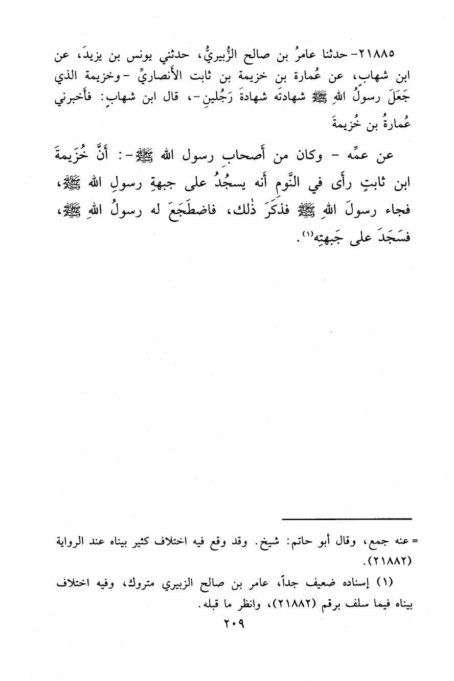 ٢١٨٨٥ - حَدَّثَنَا عَامِرُ بْنُ صَالِحٍ الزُّبَيْرِيُّ، حَدَّثَنِي يُونُسُ بْنُ يَزِيدَ، عَنْ ابْنِ شِهَابٍ، عَنْ عُمَارَةَ بْنِ خُزَيْمَةَ بْنِ ثَابِتٍ الْأَنْصَارِيِّ وَخُزَيْمَةُ الَّذِي جَعَلَ رَسُولُ اللهِ صَلَّى اللهُ عَلَيْهِ وَسَلَّمَ شَهَادَتَهُ شَهَادَةَ رَجُلَيْنِ، قَالَ ابْنُ شِهَابٍ: فَأَخْبَرَنِي عُمَارَةُ بْنُ خُزَيْمَةَ، عَنْ عَمِّهِ، وَكَانَ مِنْ أَصْحَابِ رَسُولِ اللهِ صَلَّى اللهُ عَلَيْهِ وَسَلَّمَ: أَنَّ خُزَيْمَةَ بْنَ ثَابِتٍ رَأَى فِي النَّوْمِ أَنَّهُ يَسْجُدُ عَلَى جَبْهَةِ رَسُولِ اللهِ صَلَّى اللهُ عَلَيْهِ وَسَلَّمَ، فَجَاءَ رَسُولَ اللهِ صَلَّى اللهُ عَلَيْهِ وَسَلَّمَ فَذَكَرَ ذَلِكَ، " فَاضْطَجَعَ لَهُ رَسُولُ اللهِ صَلَّى اللهُ عَلَيْهِ وَسَلَّمَ فَسَجَدَ عَلَى جَبْهَتِهِ " (١)
