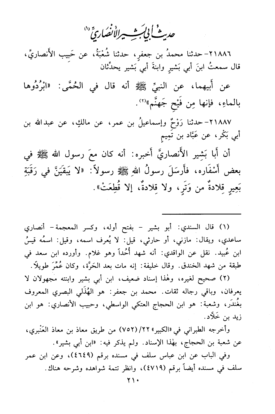 ٢١٨٨٧ - حَدَّثَنَا رَوْحٌ، وَإِسْمَاعِيلُ بْنُ عُمَرَ، عَنْ مَالِكٍ، عَنْ عَبْدِ اللهِ بْنِ أَبِي بَكْرٍ، عَنْ عَبَّادِ بْنِ تَمِيمٍ، أَنَّ أَبَا بَشِيرٍ الْأَنْصَارِيَّ، أَخْبَرَهُ: أَنَّهُ كَانَ مَعَ رَسُولِ اللهِ صَلَّى اللهُ عَلَيْهِ وَسَلَّمَ فِي بَعْضِ أَسْفَارِهِ، فَأَرْسَلَ رَسُولُ اللهِ صَلَّى اللهُ عَلَيْهِ وَسَلَّمَ رَسُولًا: " لَا يَبْقَيَنَّ فِي رَقَبَةِ بَعِيرٍ قِلَادَةٌ مِنْ وَتَرٍ، وَلَا قِلَادَةٌ، إِلَّا قُطِعَتْ "