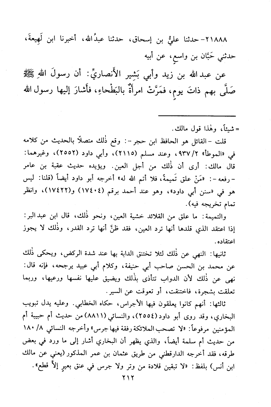 قلت -القائل هو الحافظ ابن حجر-: وقع ذلك متصلاً بالحديث من كلامه في "الموطأ" ٢/٩٣٧، وعند مسلم (٢١١٥) ، وأبي داود (٢٥٥٢) ، وغيرهما: قال مالك: أرى أن ذلك من أجل العين. ويؤيده حديث عقبة بن عامر -رفعه-: "مَنْ علق تَميمةً، فلا أتم الله له" أخرجه أبو داود أيضاً (قلنا: ليس هو في "سنن أبي داود"، وهو عند أحمد برقم (١٧٤٠٤) و (١٧٤٢٢) ، وانظر تمام تخريجه فيه) .